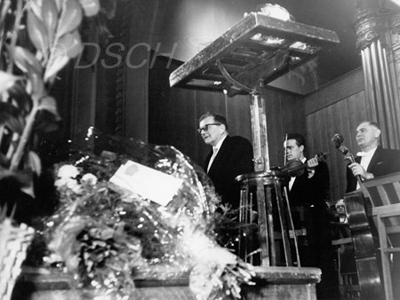 The celebration in honour of Shostakovich on 25 September 1966. On the left are Mstislav Rostropovich and Yevgeni Svetlanov.