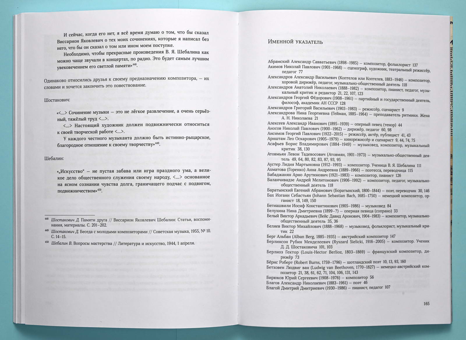 The book is dedicated to friendship and creative relationship between Dmitri Shostakovich and Vissarion Shebalin, which lasted almost 40 years. It is based on various documents: letters, memoirs, texts of performances and statements of both composers in print, which record not only the main milestones of their work, but also reflect the commonality of their aesthetic views, judgments about the ways of development of Soviet music and national culture, about the problems of musical education. These materials were collected and prepared for publication by Alisa Maksimovna Shebalina (Vissarion Shebalin's widow) in the form of a handwritten book, which is being published for the first time.