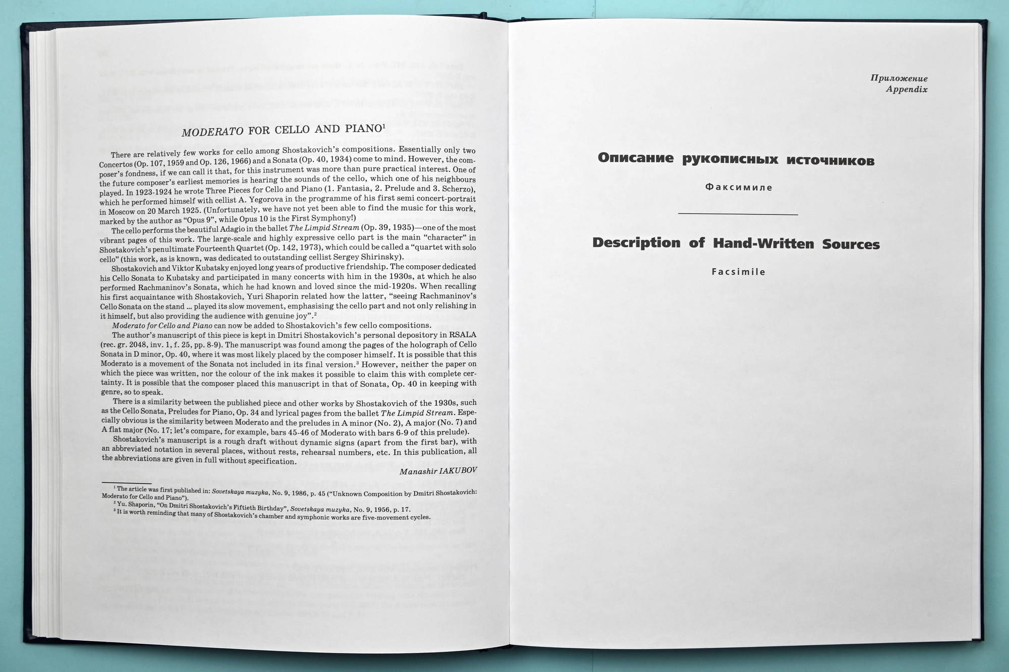 The article and piece was first published in: Sovetskaya muzyka, No. 9, 1986, p. 45 (Manashir Yakubov: “Unknown Composition by Dmitri Shostakovich: Moderato for Cello and Piano”).