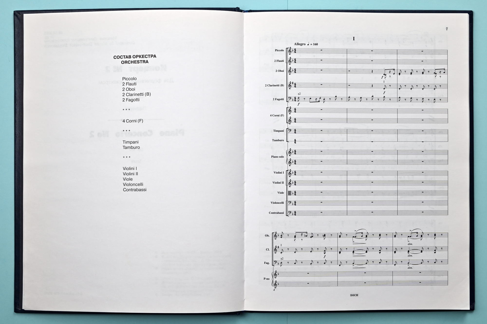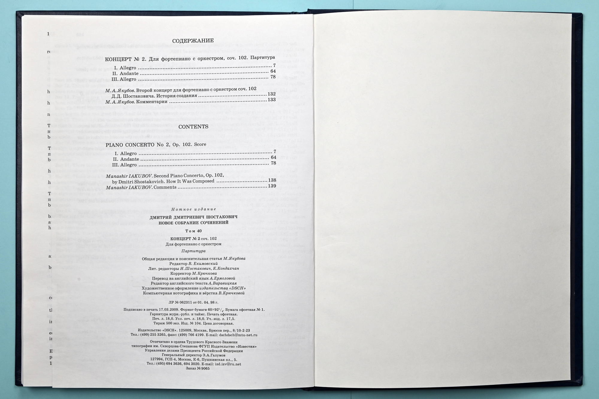 Identifying the “accepted” text of the score of the Second Piano Concerto, Op. 102, is associated with certain specific difficulties. The author’s manuscripts of the score and piano score contain a large number of discrepancies which are at times rather considerable. The differences in the parts of the solo piano in these two sources are particularly significant. So it is very difficult to give unequivocal preference to the Piano solo version either in the score or in the author’s arrangement of the concerto for two pianos.