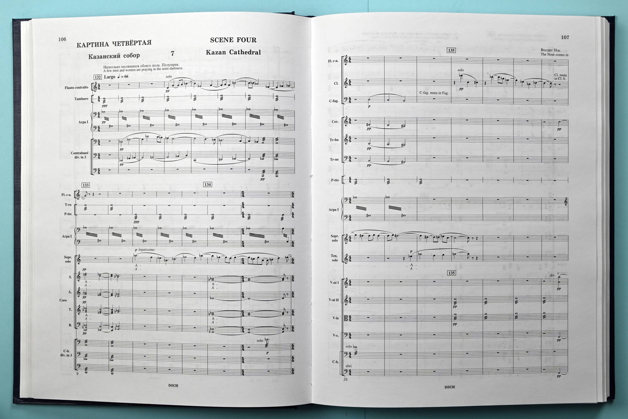 A satirical opera in three acts, for chamber orchestra (with 2 harps, piano, flexatone, domras, and balalaikas), S.A.T.B. chorus, and 82 singing/speaking parts.