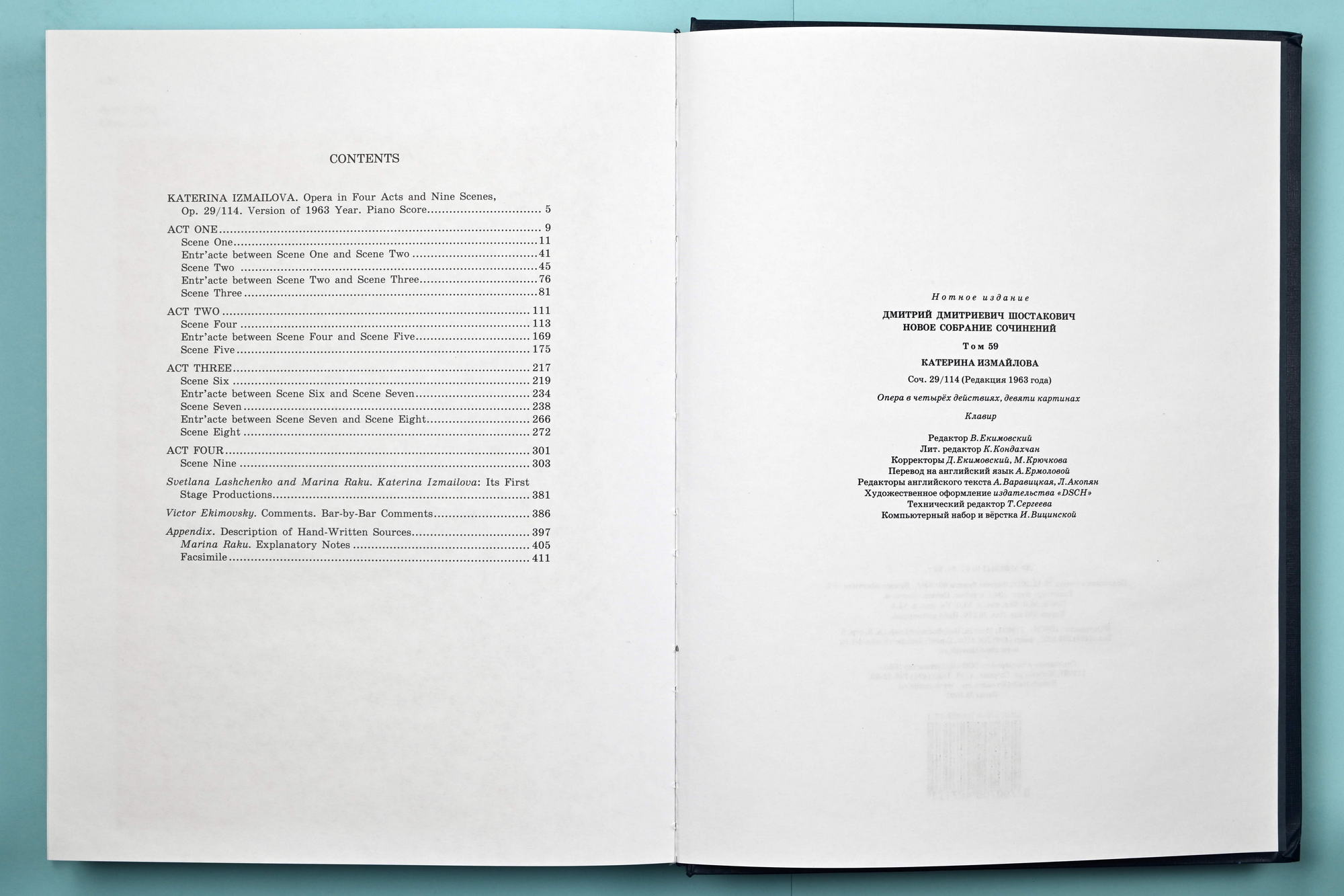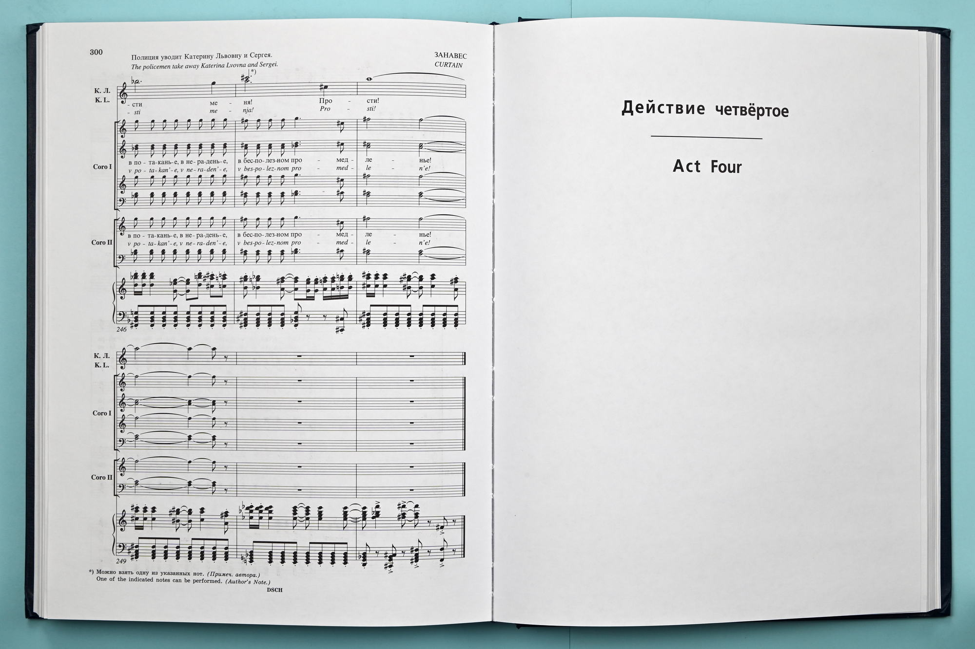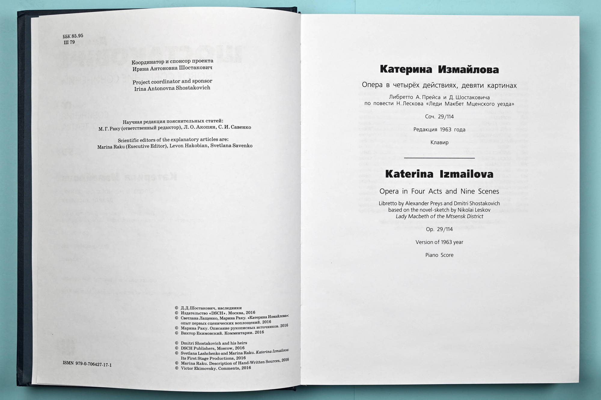 The full score of the first version of the opera was not published during Shostakovich’s lifetime. In the second half of the 1970s, the composer’s widow, Irina Shostakovich, sent the copy of the manuscript she had to Mstislav Rostropovich for performing and recording. In 1978, this version of the work was recorded by Rostropovich and the musician handed the notation he had to Hans Sikorski Publishers. The publisher also received world rights from the heirs to hire out the first version of the opera. Later, when conditions developed in Russia for performing and publishing the first version of the work, Hans Sikorski Publishers handed a copy to DSCH Publishers for hire of the first version of the opera in the composer’s homeland.