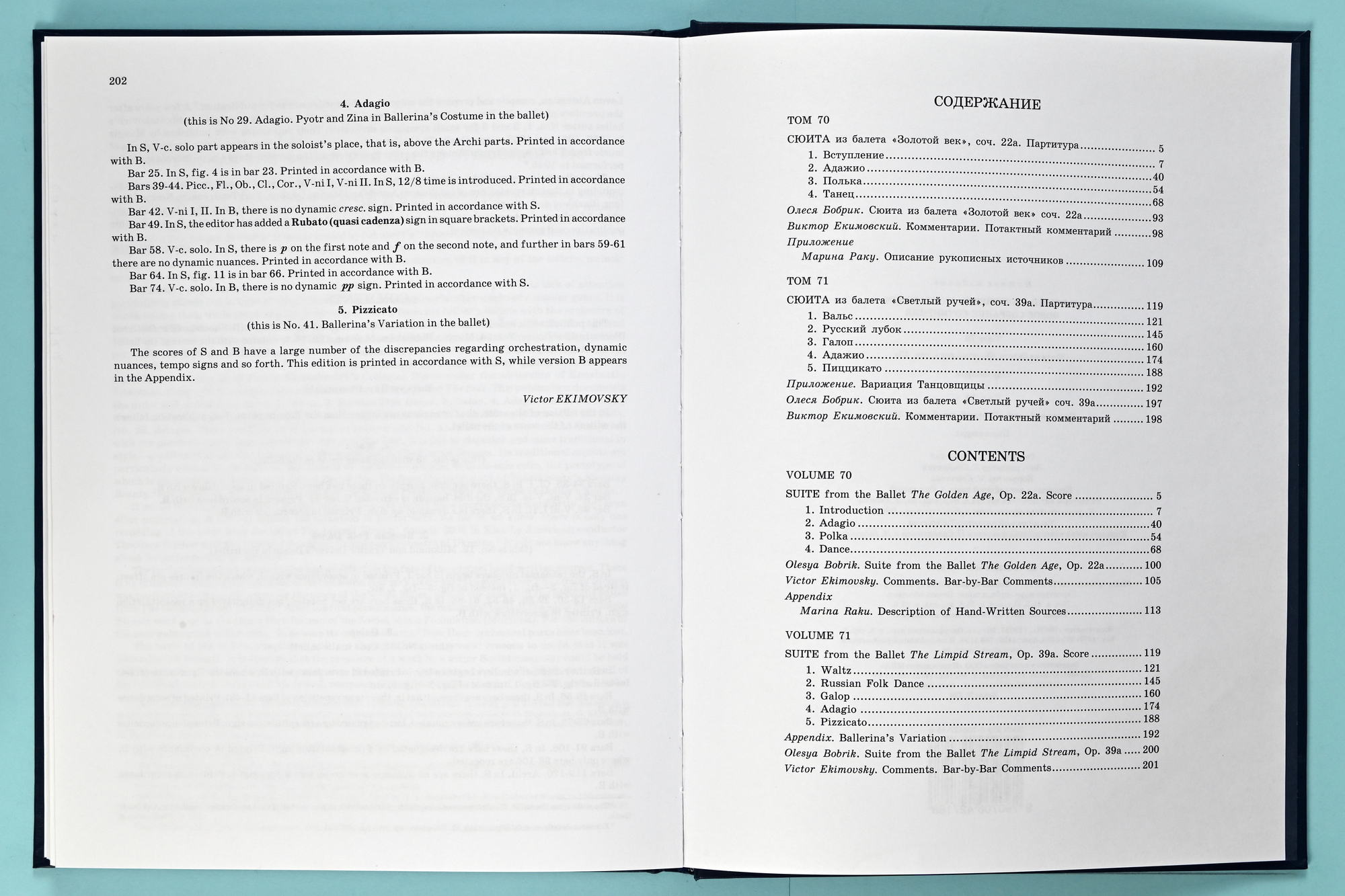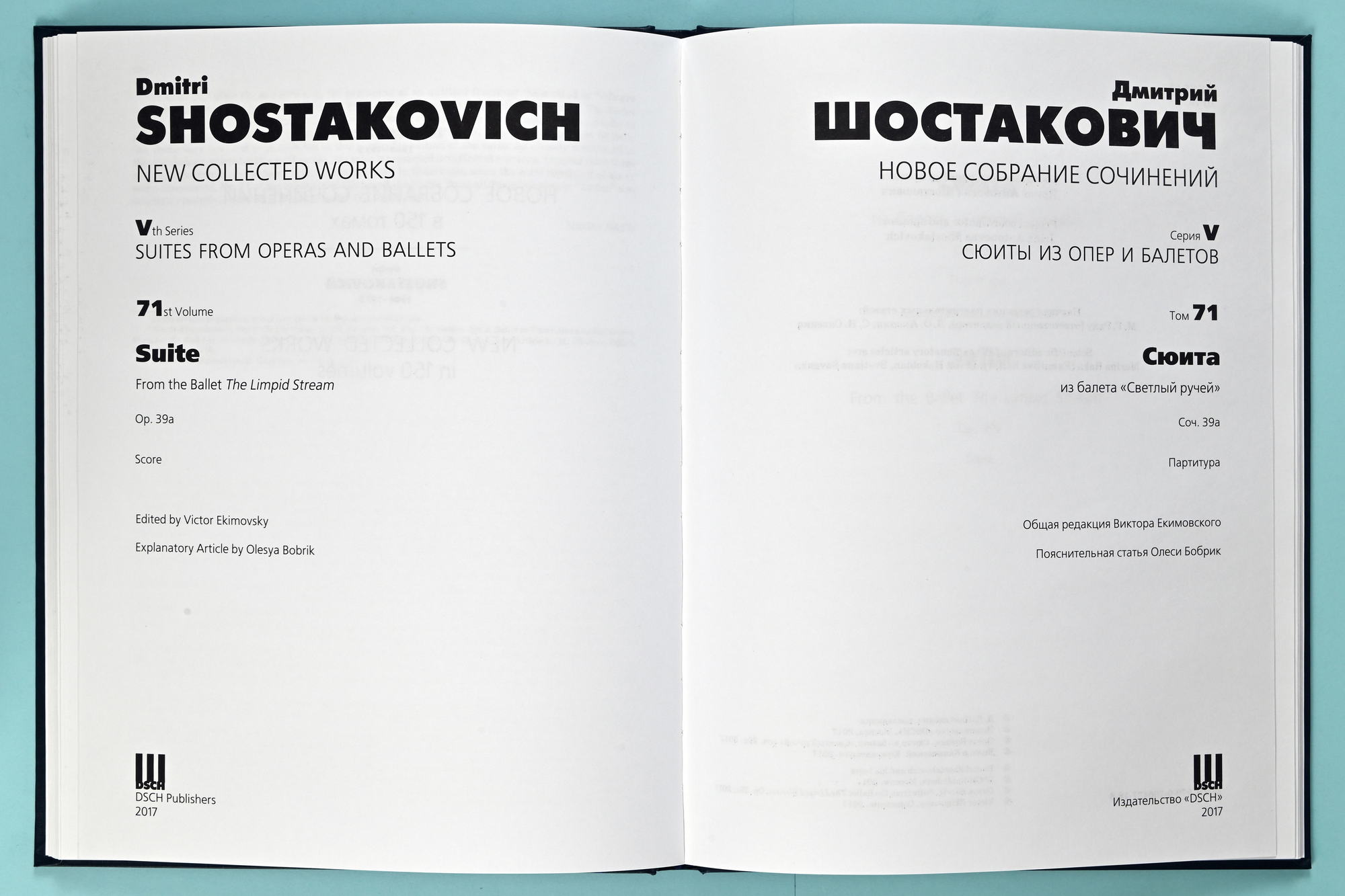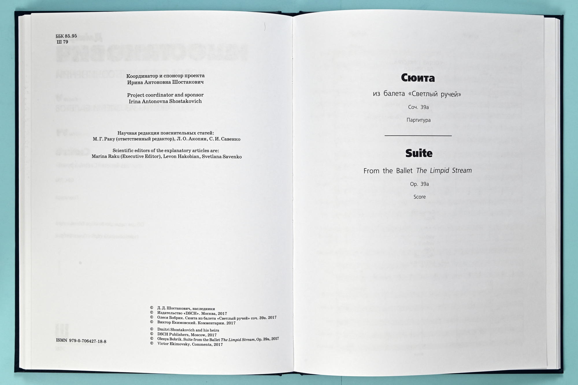 In 1987, the score of the suite from the ballet The Limpid Stream for full symphony orchestra was published in Volume 26 of Dmitri Shostakovich’s Collected Works under the editorship of Konstantin Titarenko, along with the scores of the suites from The Golden Age and The Bolt. This publication documents the order and names of its parts (in the ballet, they correspond to):