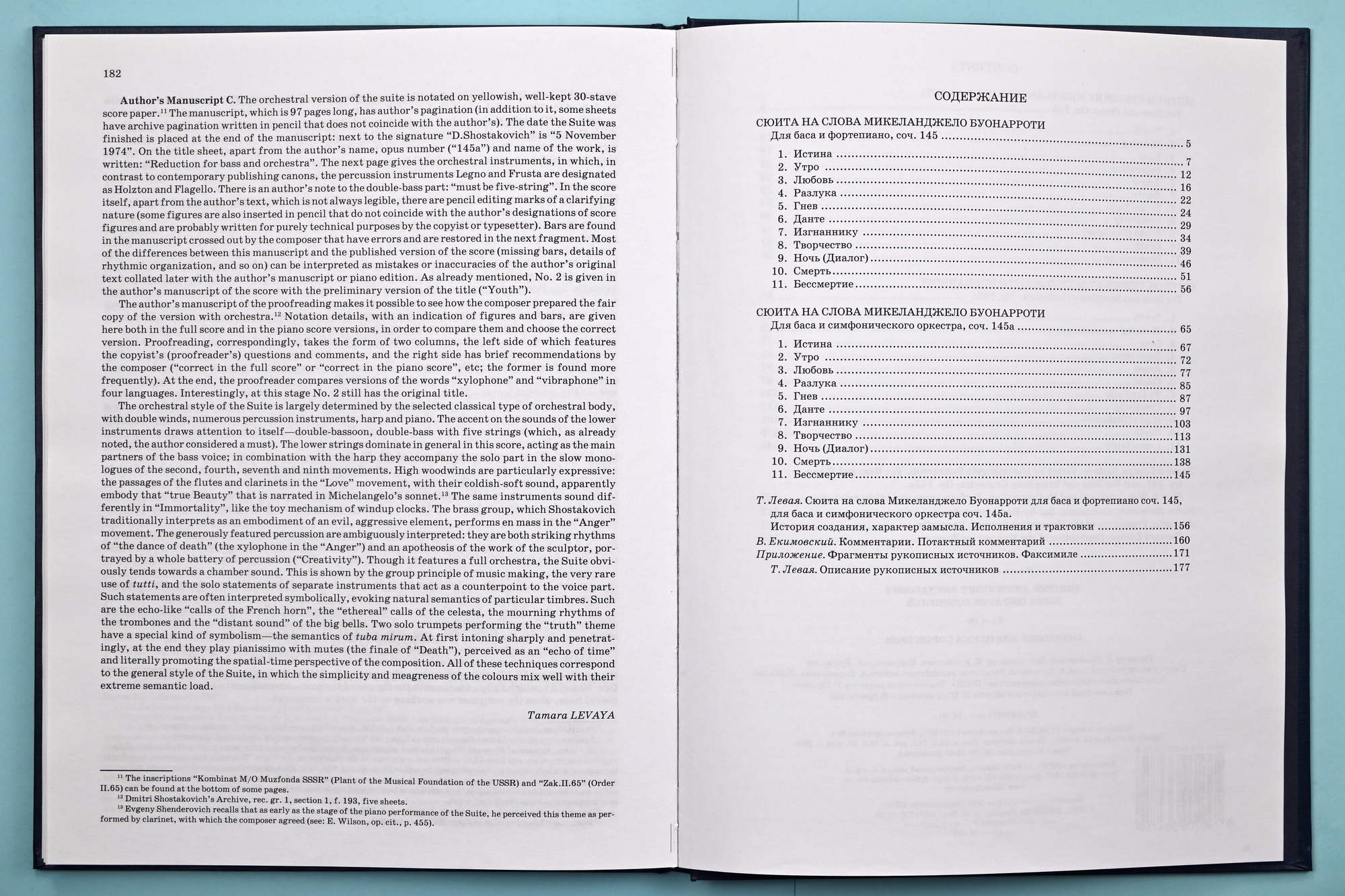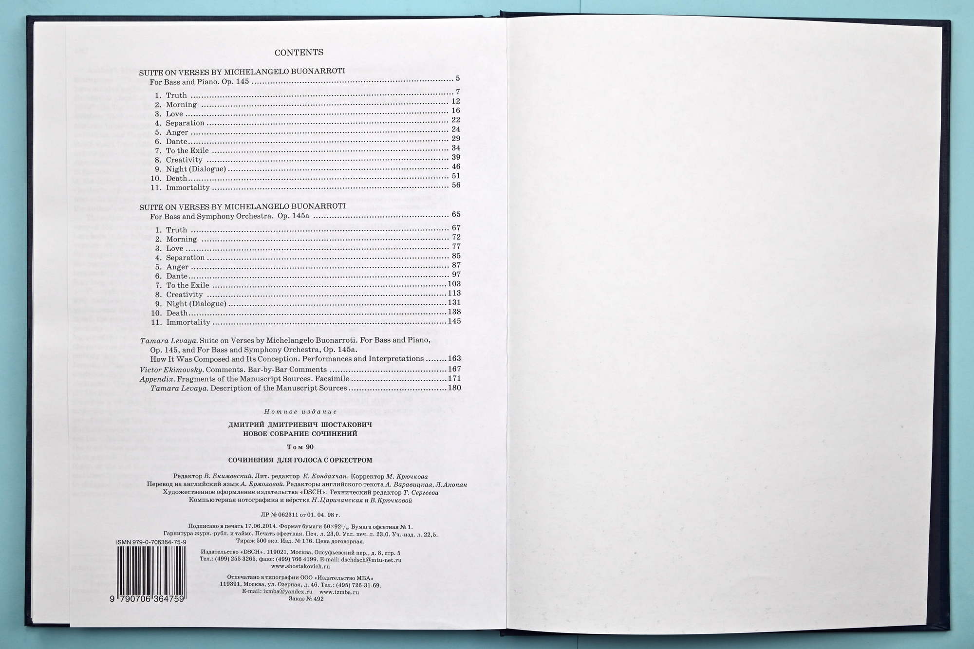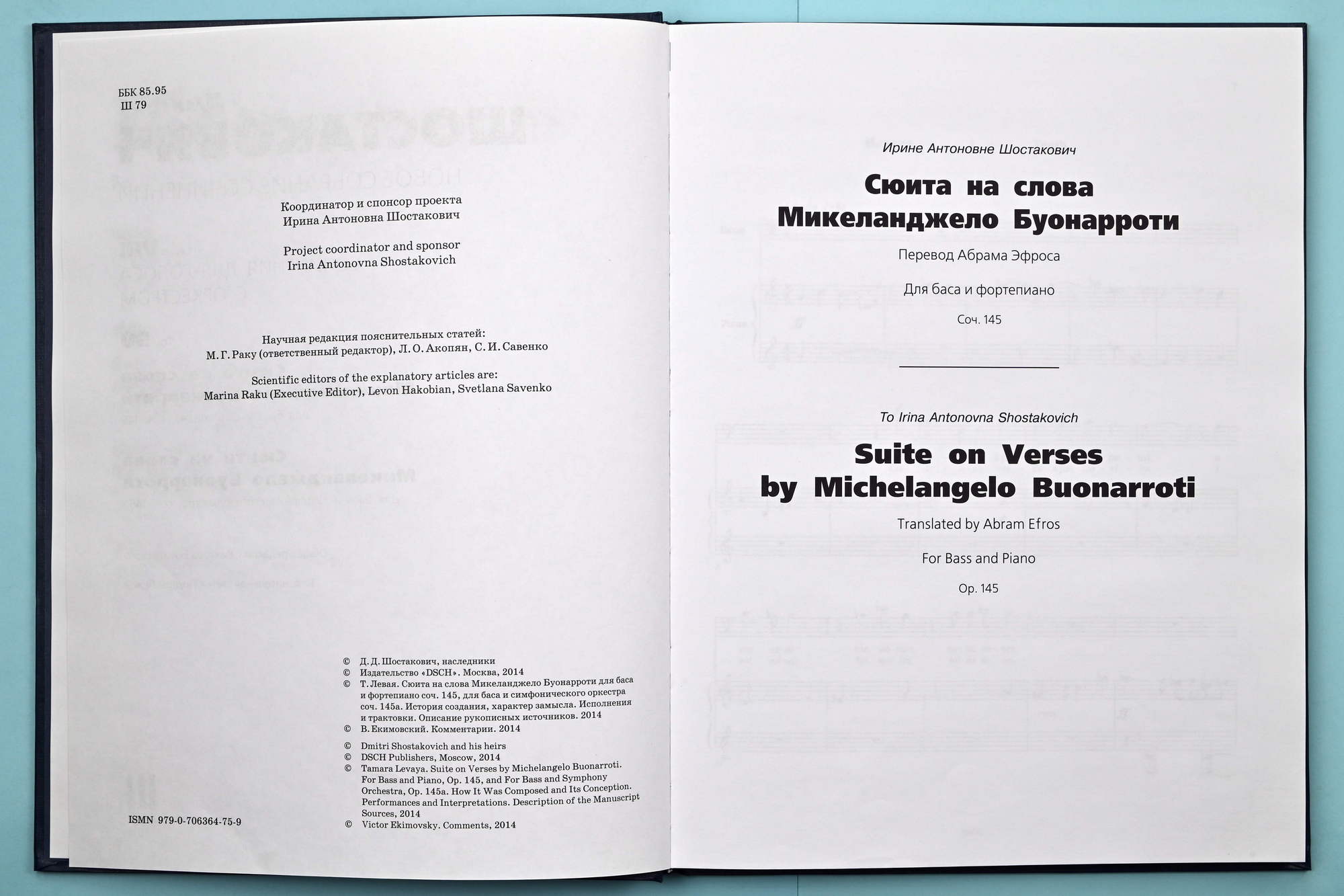 This publication is based on the 1984 edition (Collected Works, Vol. 33, Muzyka Publishers, Moscow). The music text has been collated with the author’s manuscript kept in Dmitri Shostakovich’s Archive (rec. gr. 1, section 1, f. 190). When necessary, the first 1975 edition (Muzyka Publishers, Moscow) and edition of the author’s version for bass and symphony orchestra, Op. 145a (Collected Works, Vol. 31, Muzyka Publishers, Moscow, 1982) are taken into account.