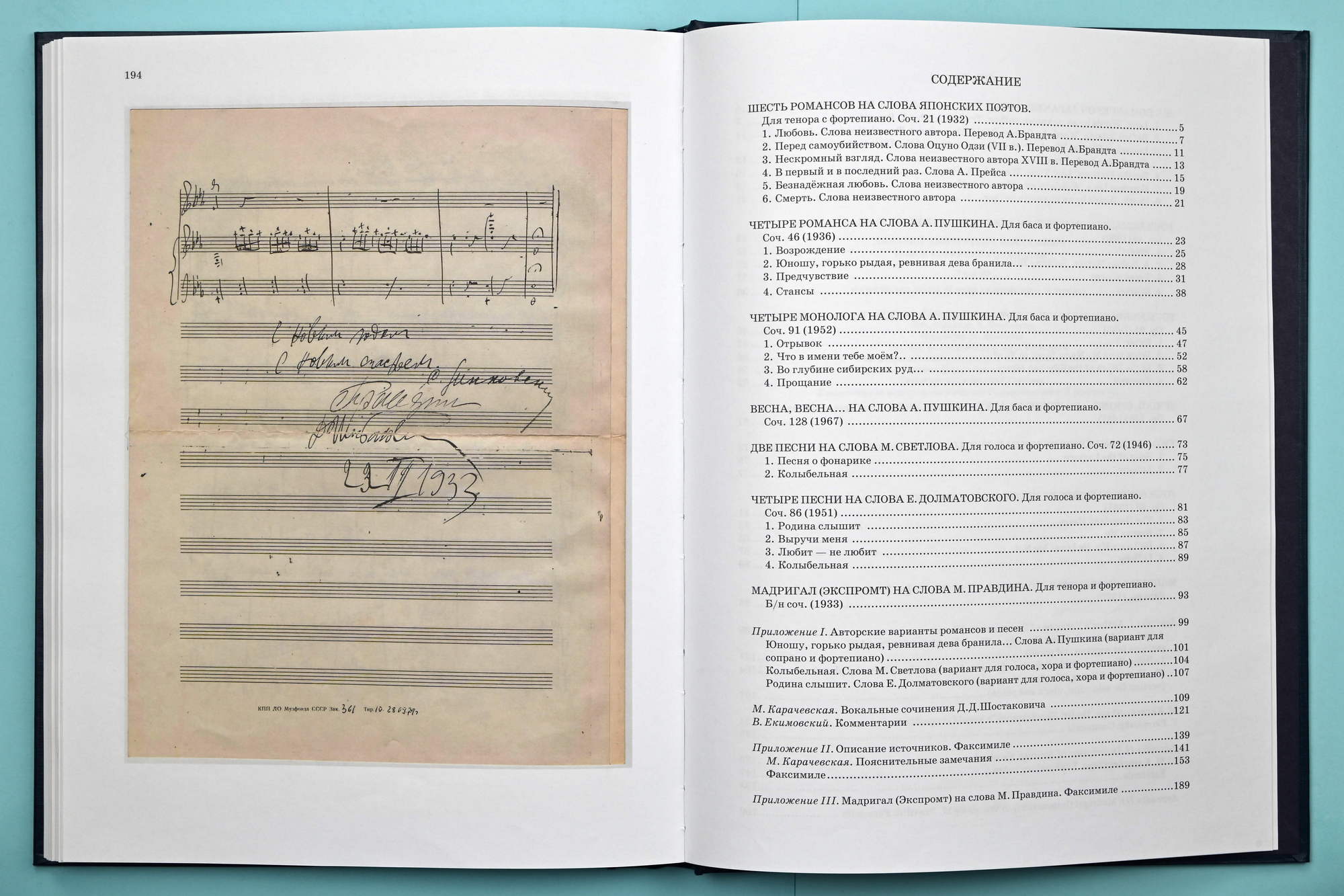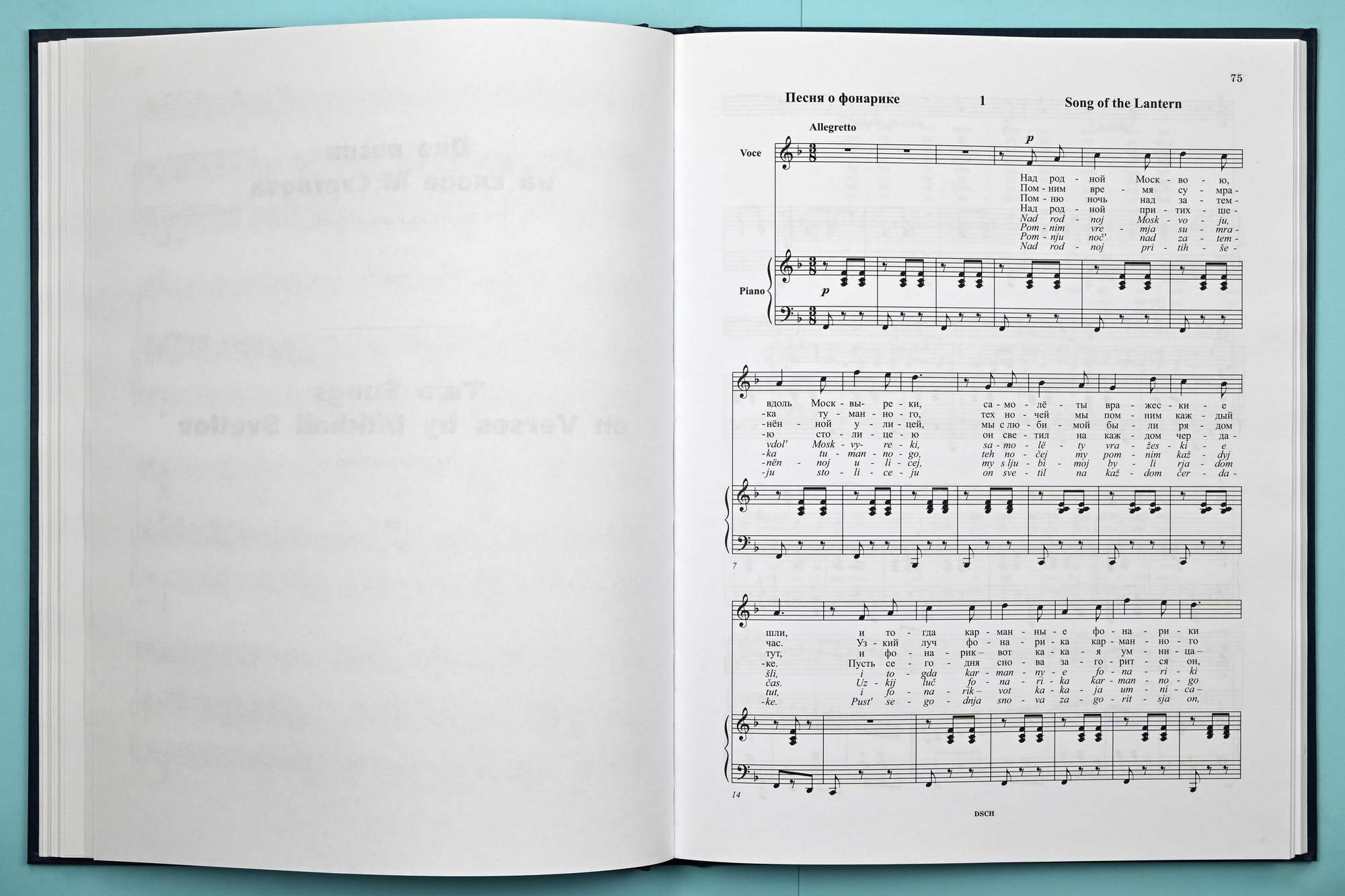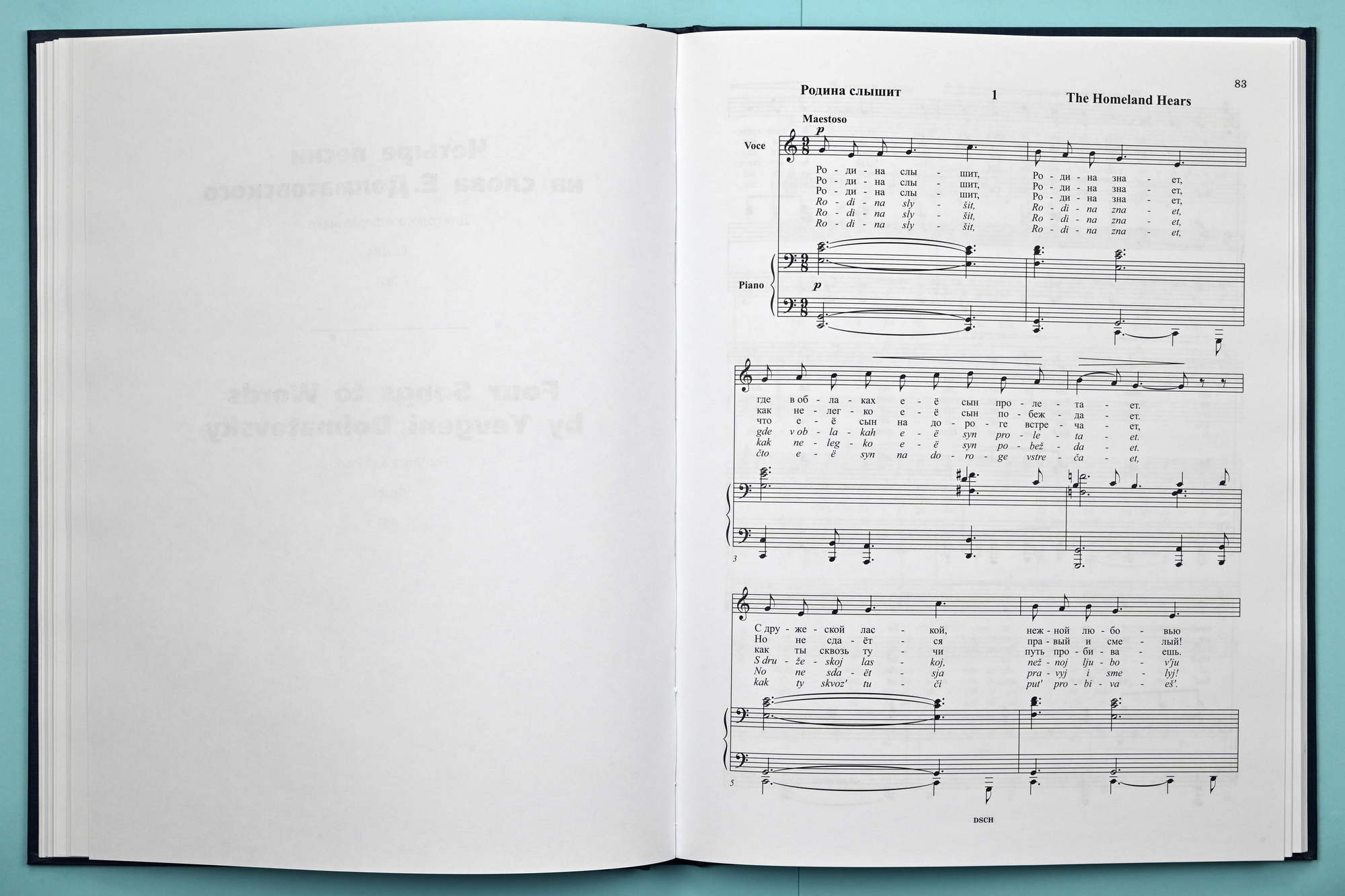This publication is based on the 1982 edition: D. Shostakovich, Collected Works, Vol. 32, Muzyka Publishers, Moscow, collated with the author’s manuscripts. The author’s manuscript of the song “The Homeland Hears” is kept in Dmitri Shostakovich’s Archive (rec. gr. 1, section 1, f. 183), the song “Rescue Me” in the Russian State Archives of Literature and Art (rec. gr. 2048, inv. 3, f. 11), and the songs “He Loves Me, He Loves Me Not” and “Lullaby” in the VMOMK (rec. gr. 32, f. 92). The author’s version of the first song “The Homeland Hears” for solo voice, choir and piano is printed in Appendix I in accordance with the following publication: D. Shostakovich, Romances and Songs to Words by Yevgeni Dolmatovsky, Sovetsky kompozitor, Moscow, 1987.