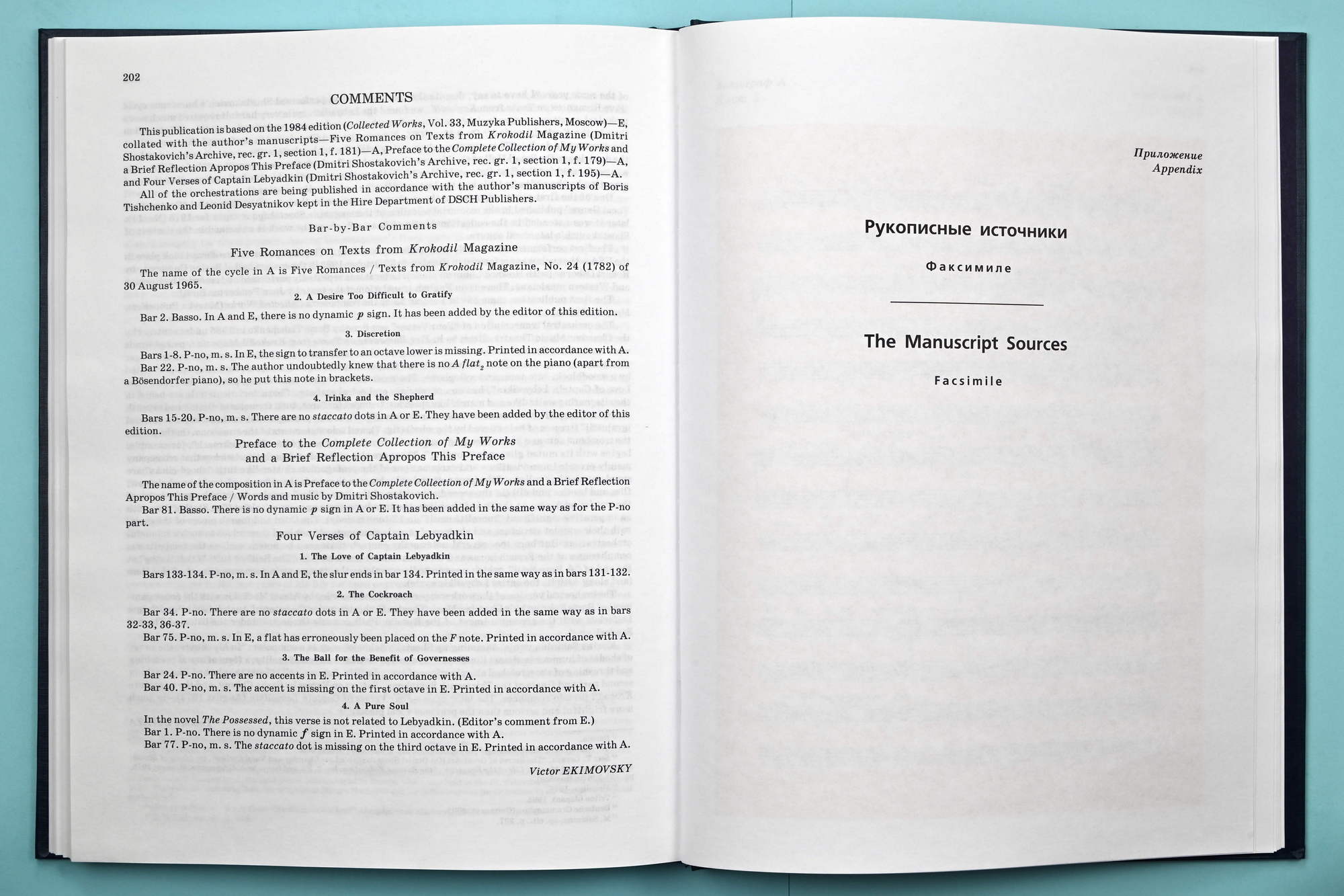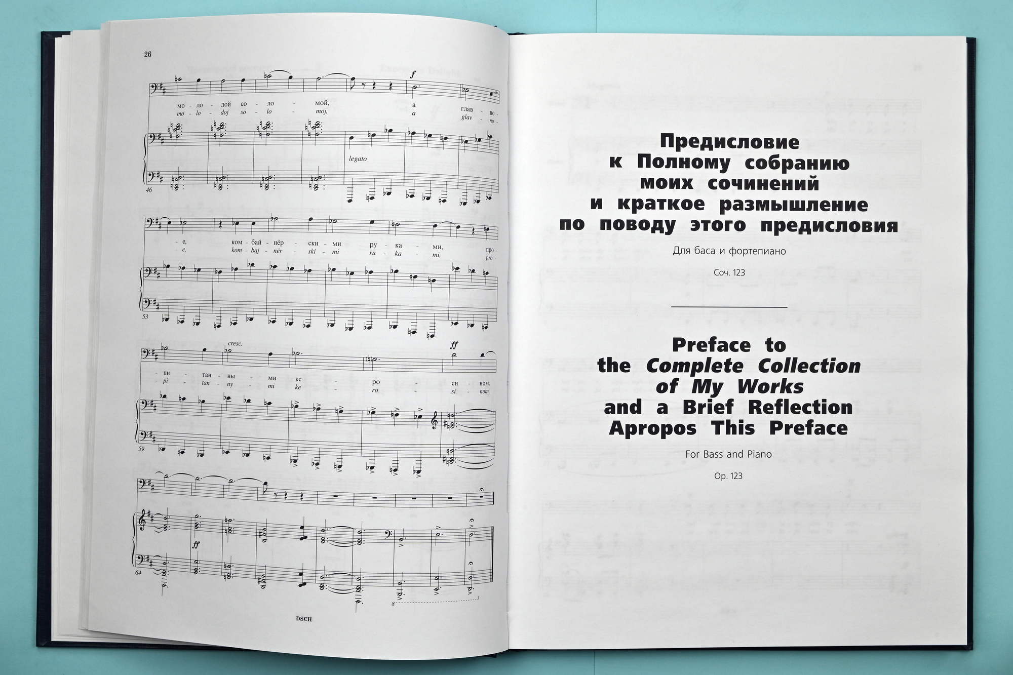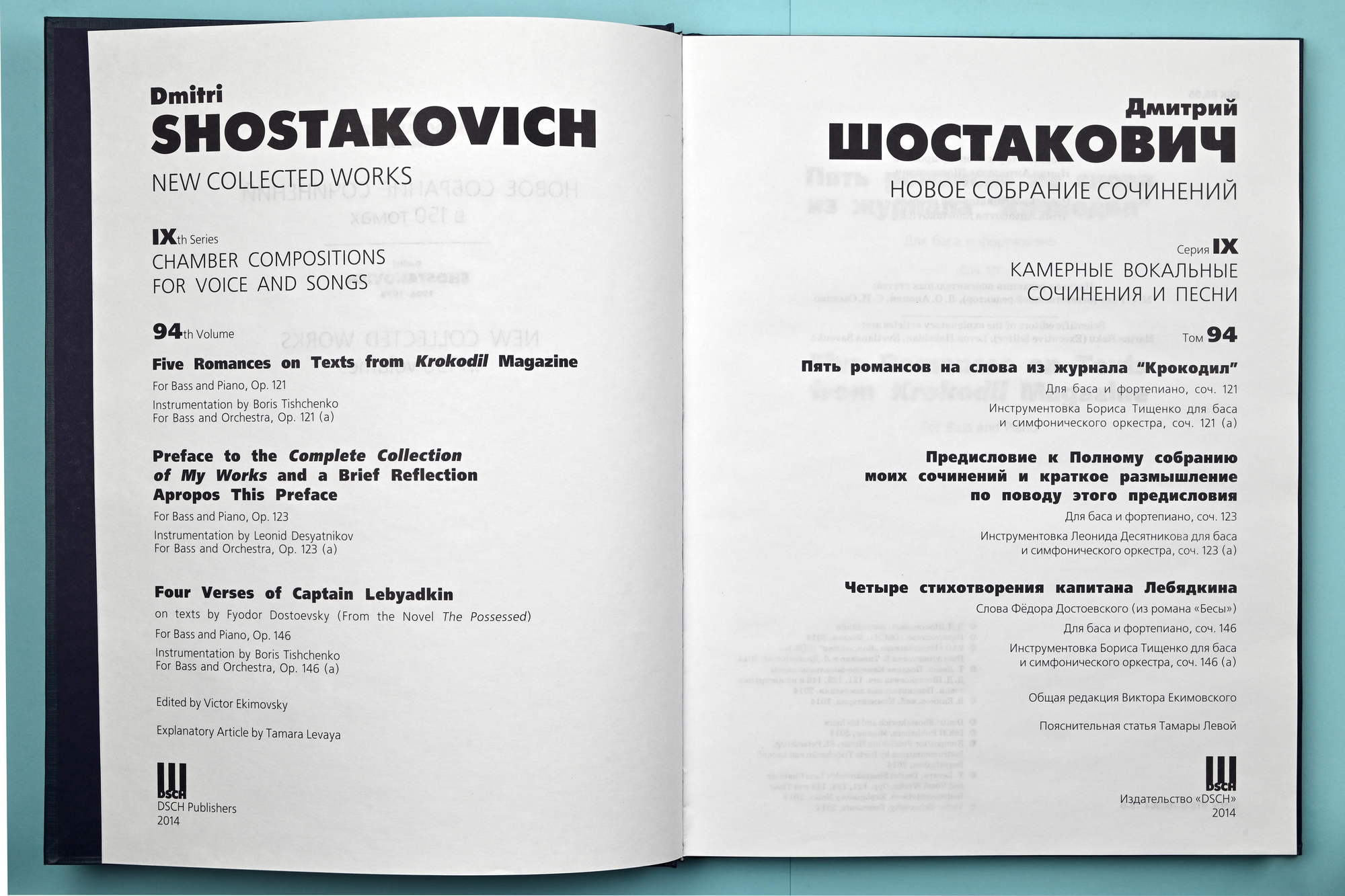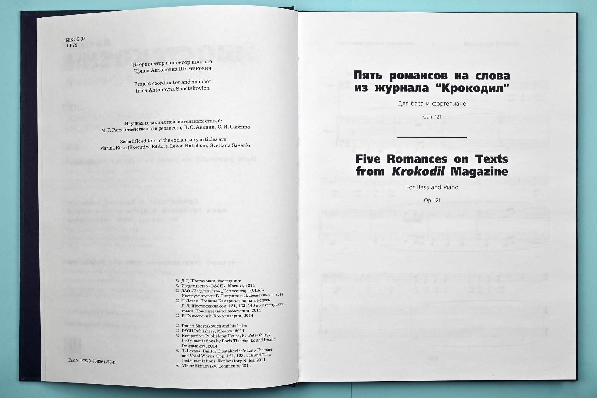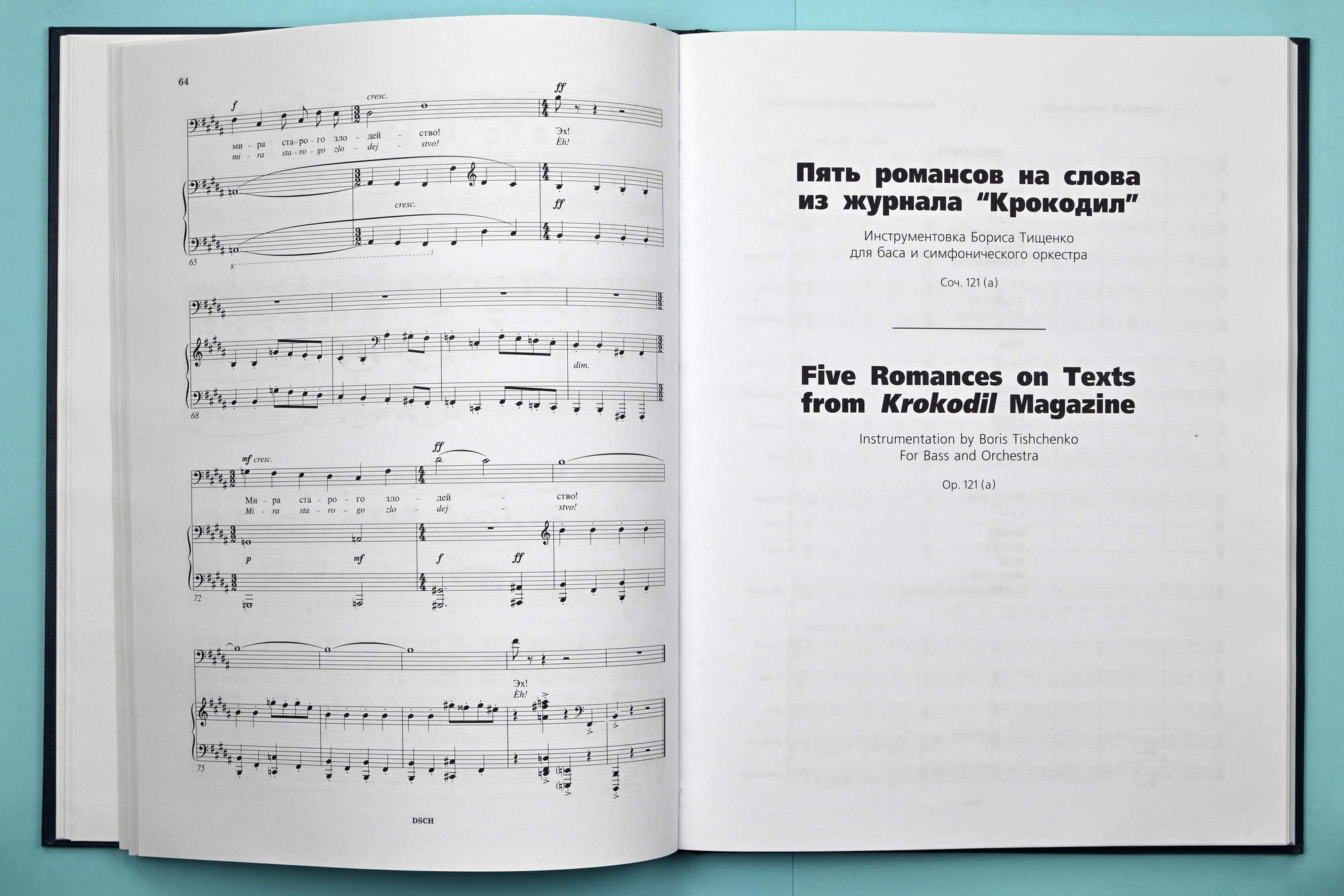 Five Romances on Texts from the Krokodil Magazine. Op. 121. Piano score. Score. (Instrumentation by B. Tishchenko. Published for the first time). Preface to the Complete Collection of My Works and a Brief Reflection Apropos This Preface. Words and music by Dmitri Shostakovich. Op. 123. Piano score. Score. (Instrumentation by L. Desyatnikov. Published for the first time). Four Verses of Captain Lebyadkin. Op. 146. Piano score. Score. (Instrumentation by B. Tishchenko. Published for the first time).