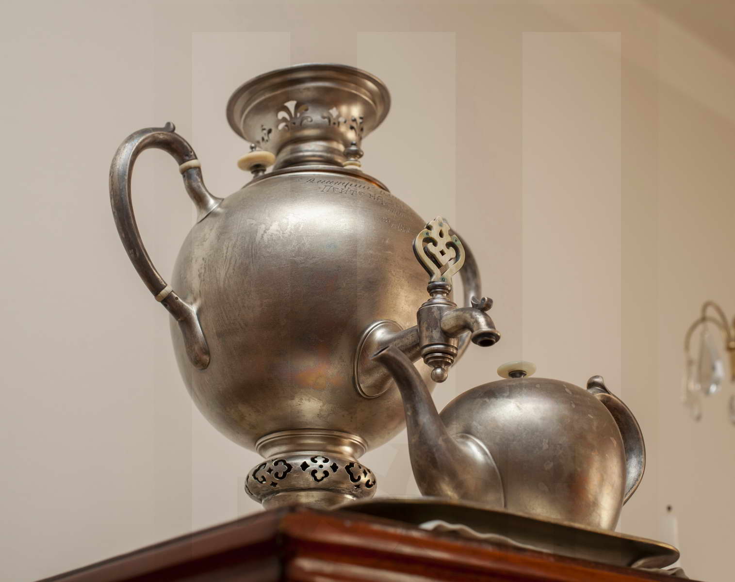 Silver dining set. A samovar with a teapot on a tray with the engraving “Dear Dmitri Dmitriyevich! Drink to your heart’s content. Group of comrades. 25. IX. 1956”. A gift from colleagues on Dmitri Shostakovich’s 50th birthday in 1956.