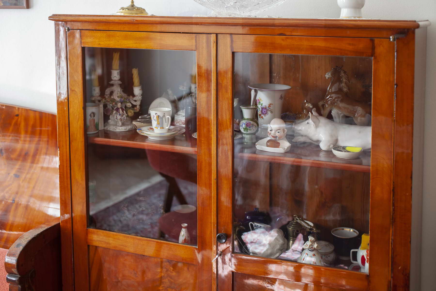 Two-leaved cabinet in the dining-room, opposite the sideboard. It has glass doors and stands on round wooden legs.