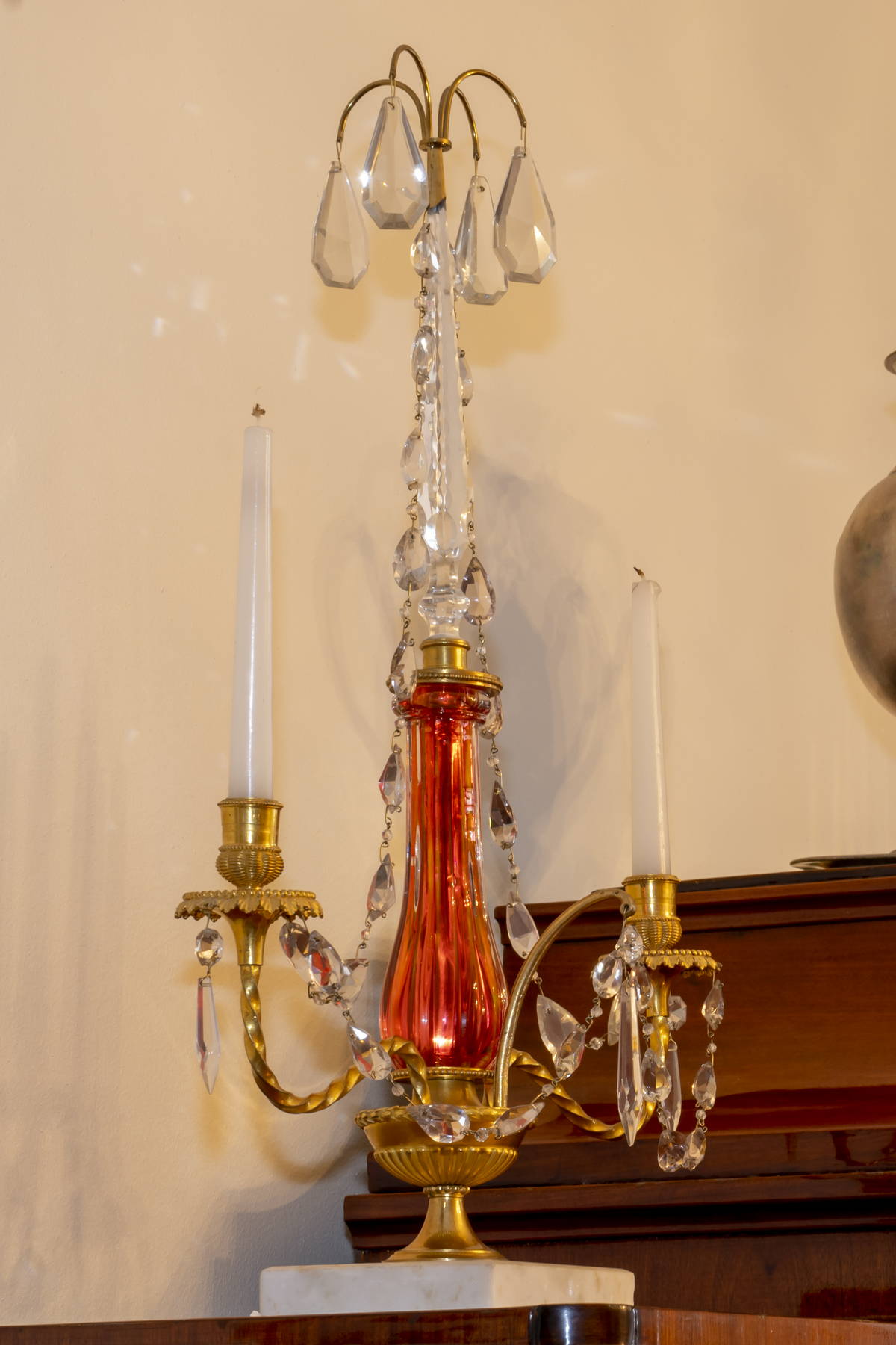 Two paired girandole candelabra for two candles. Decorated with diamond cut clear glass pendants. Brass, crystal, marble. Europe. Mid-19th century.