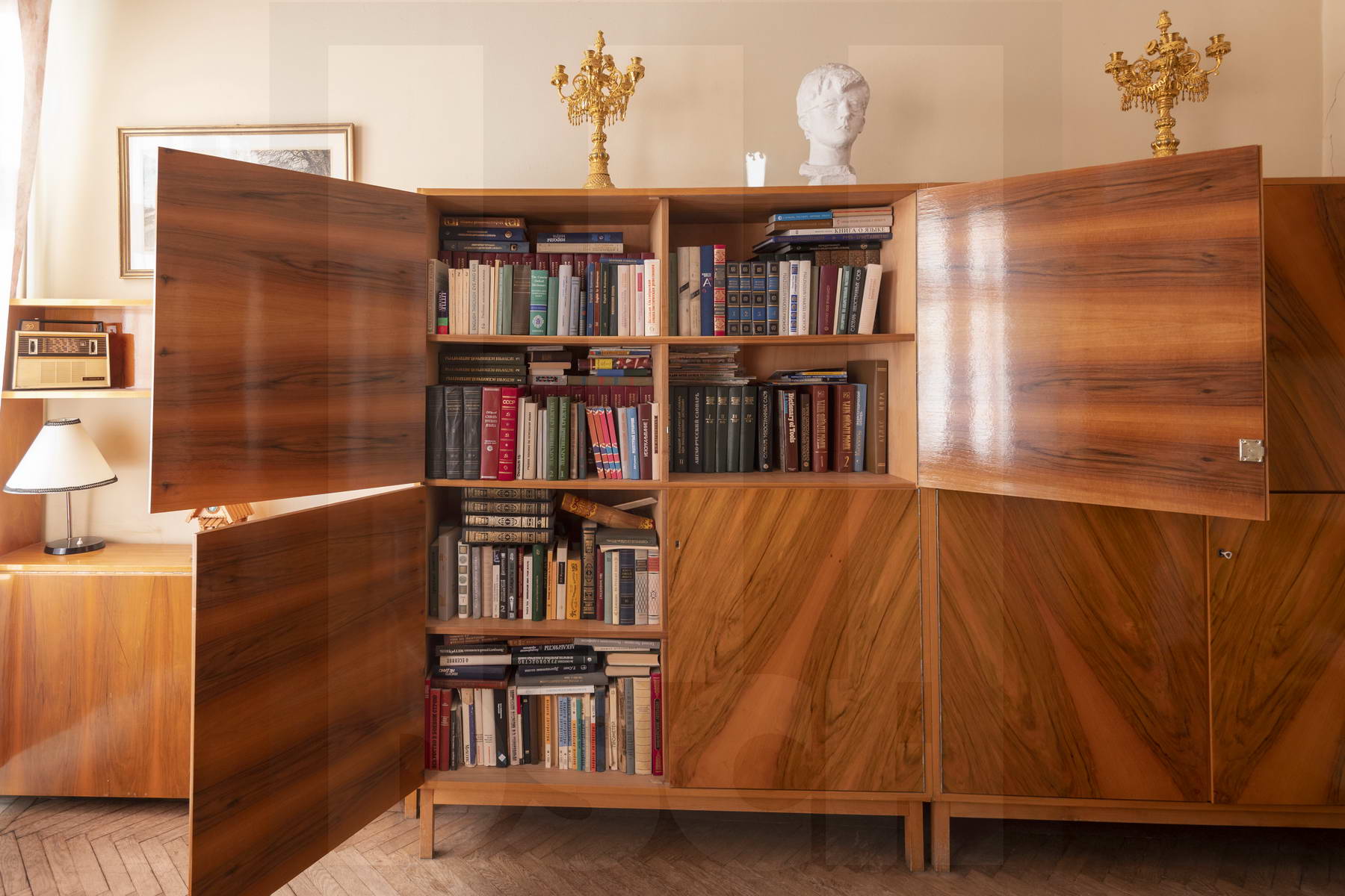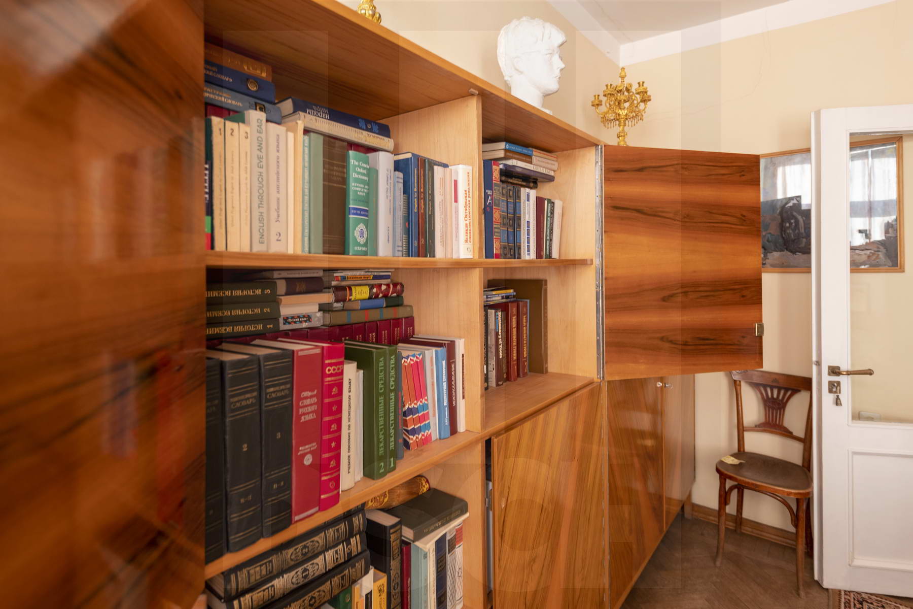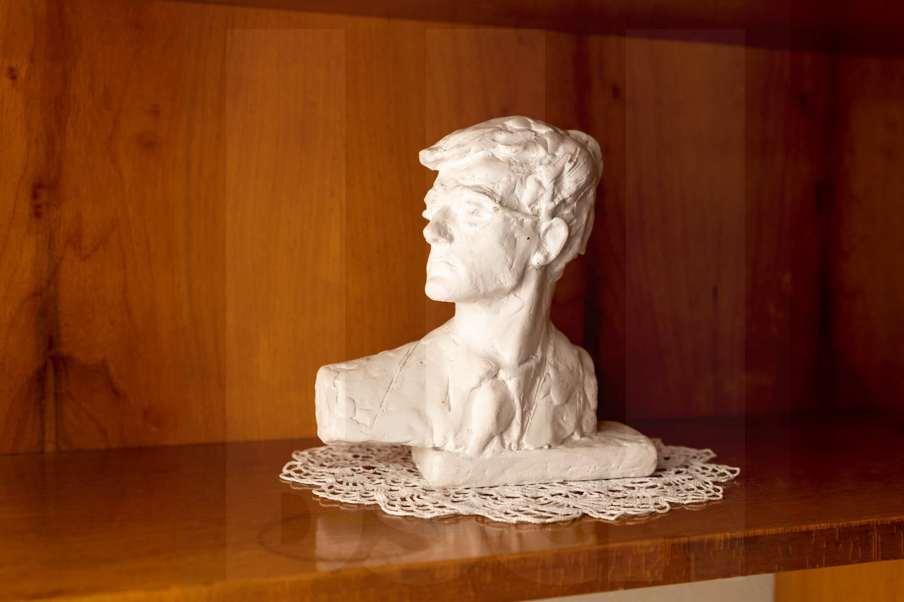 There is a sculptural portrait of Shostakovich on one of the shelves of the bookcase and another on one of the shelves of the cupboard.