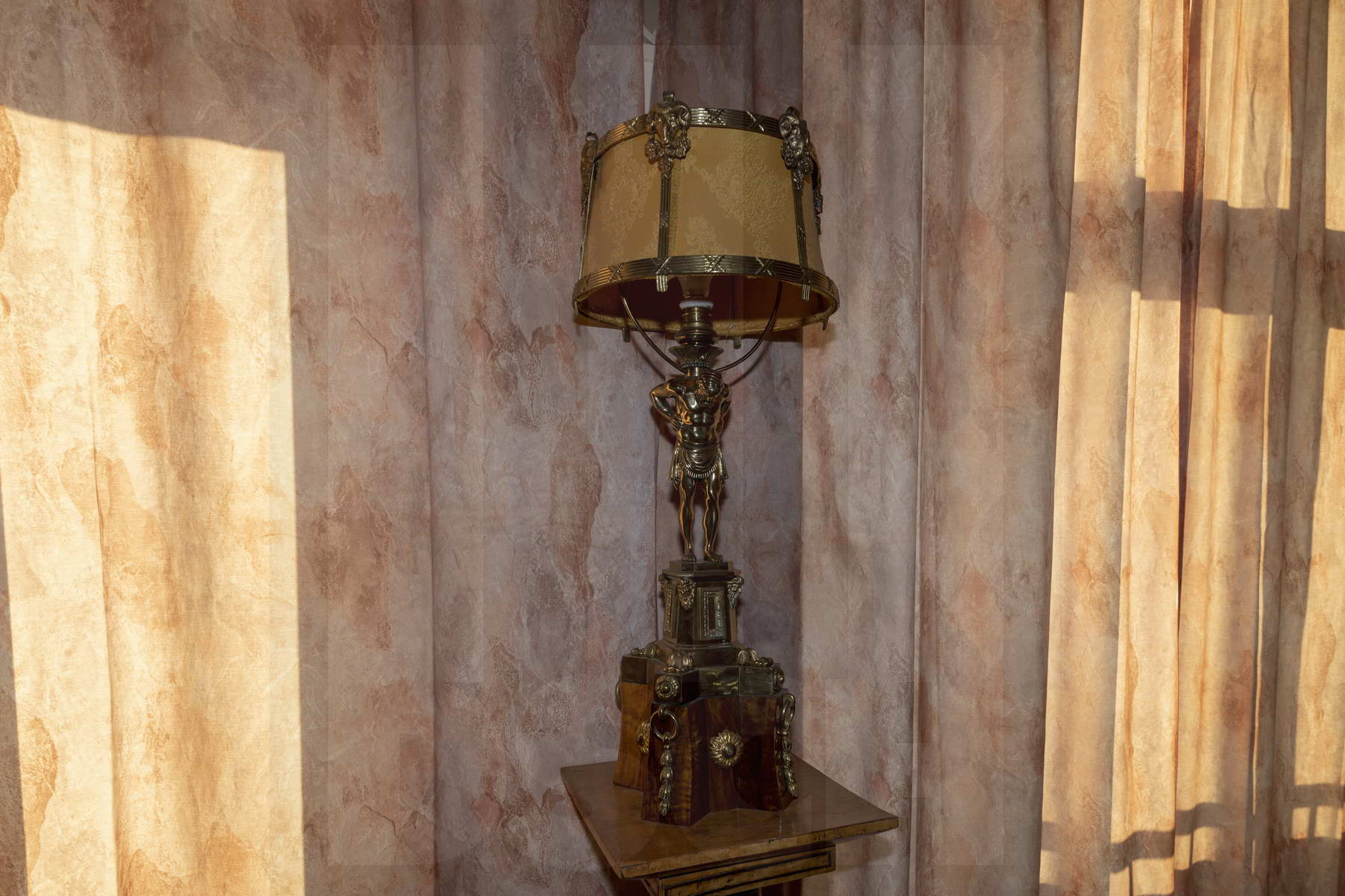 Wood, bronze, brass. Converted into an electric light fixture in the 1950s - 1960s.