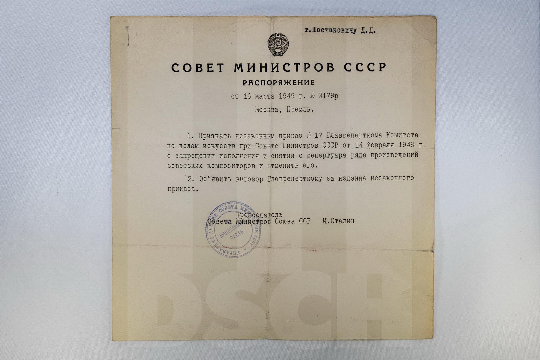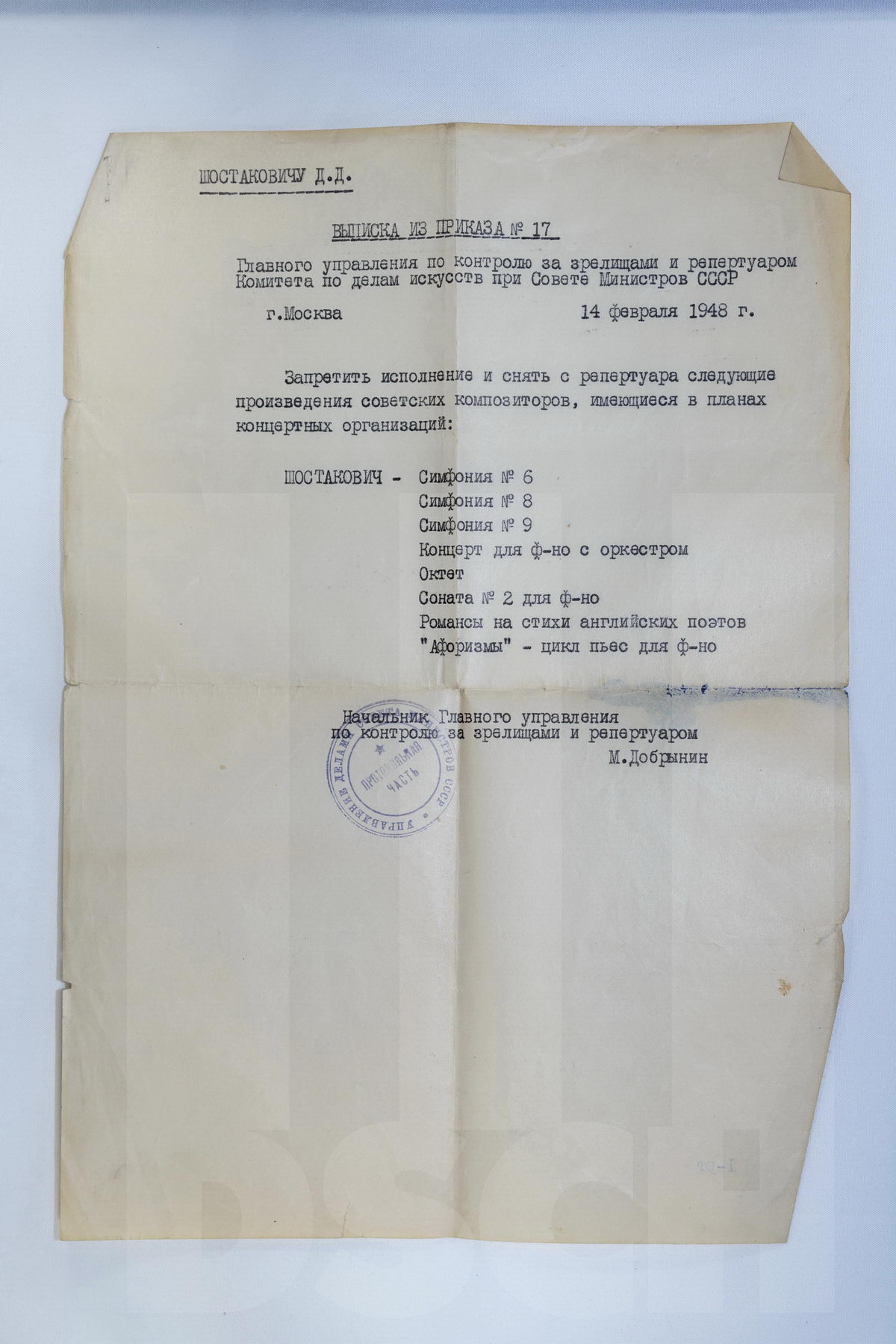 In early March 1948, the telephone rang in Shostakovich’s apartment—it was Stalin on the line. The conversation was about the composer’s trip to the United States to attend the All-American Conference for Peace as a member of the Soviet delegation. The order of the Main Committee for Control Over Performances and Repertoire was soon cancelled. Shostakovich kept an excerpt from this order and the Order by Stalin, Chairman of the USSR Council of Ministers, dated 16 March 1948, rescinding the Committee’s Order No. 17, in an envelope on his desk among his most important documents.
