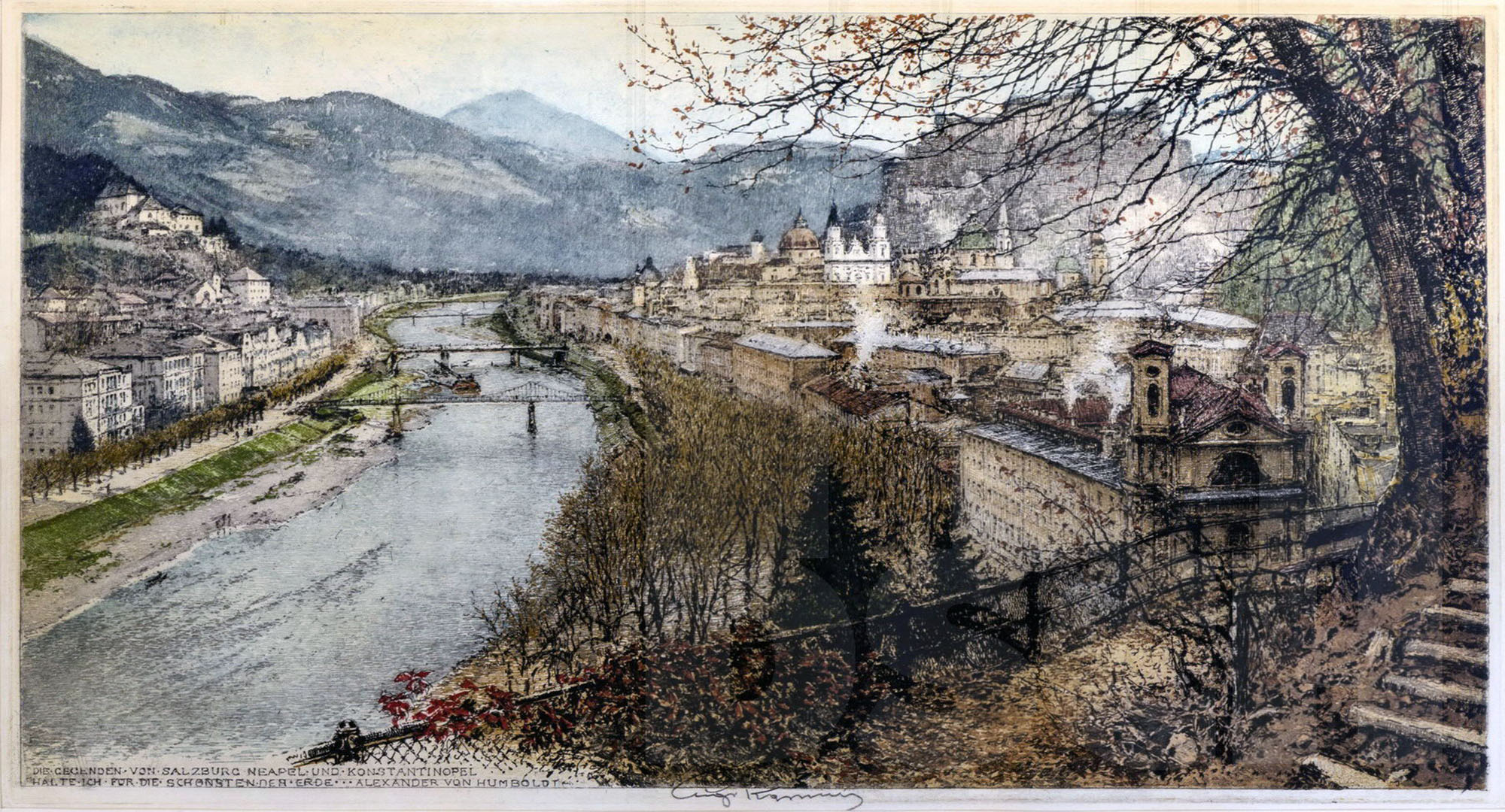 Unknown artist. Salzach river embankment. Author's print signed by the author. Salzburg, Austria. 1970s. Lithograph, color printing, pencil.