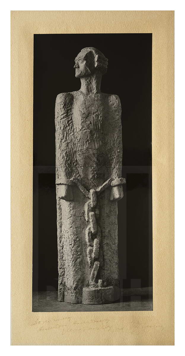 Photo of the sculpture by G. Glikman “The Prisoner in Chains”. With a dedication at the bottom.