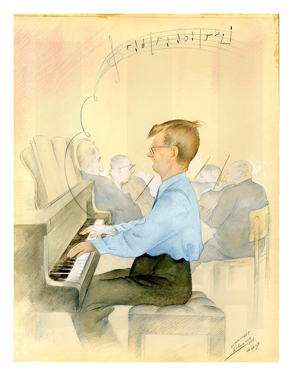 Artist A. Dobrinov. “D.D. Shostakovich. Quintet”. Shostakovich at the piano. Bulgaria, Sofia, 1956