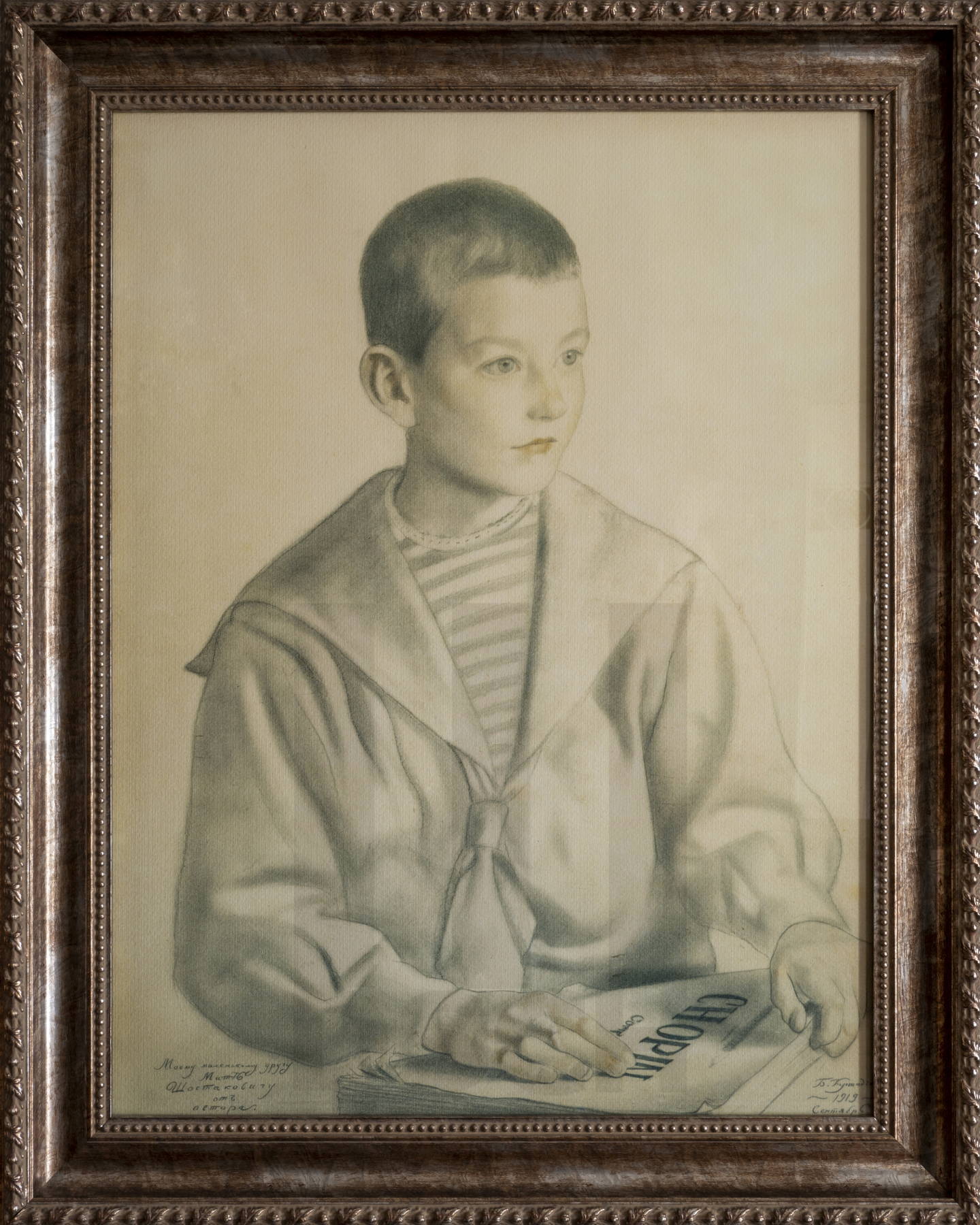 Kustodiev B. M. Portrait of Mitya Shostakovich. Petrograd, 1919. Sanguine, charcoal pencil. With a dedication: “To my little friend Mitya Shostakovich from the author”.