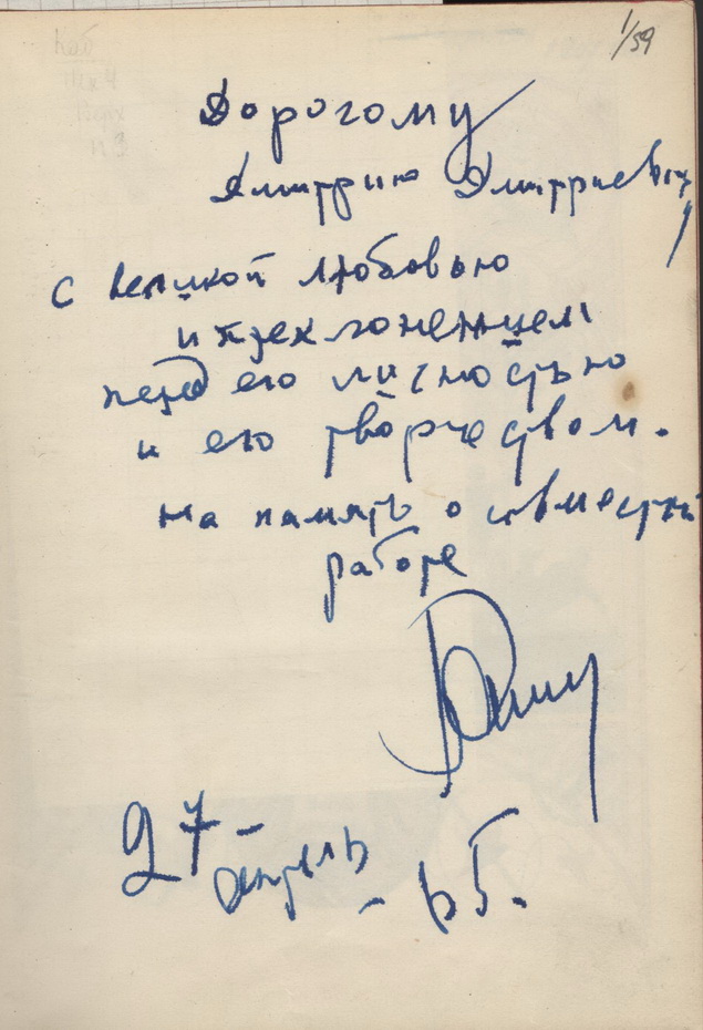 With a dedication: “To dear Dmitry Dmitrievich with great love and admiration for his personality and his work. In memory of teamwork. April 27, 1965”.