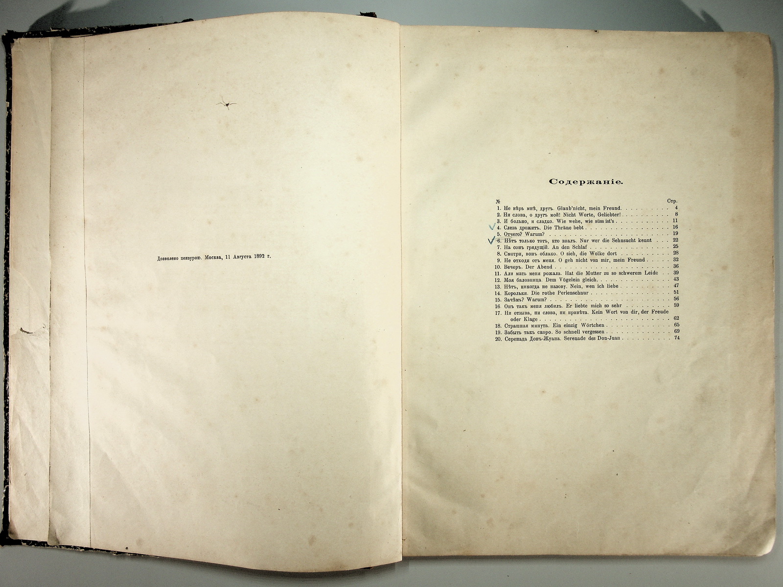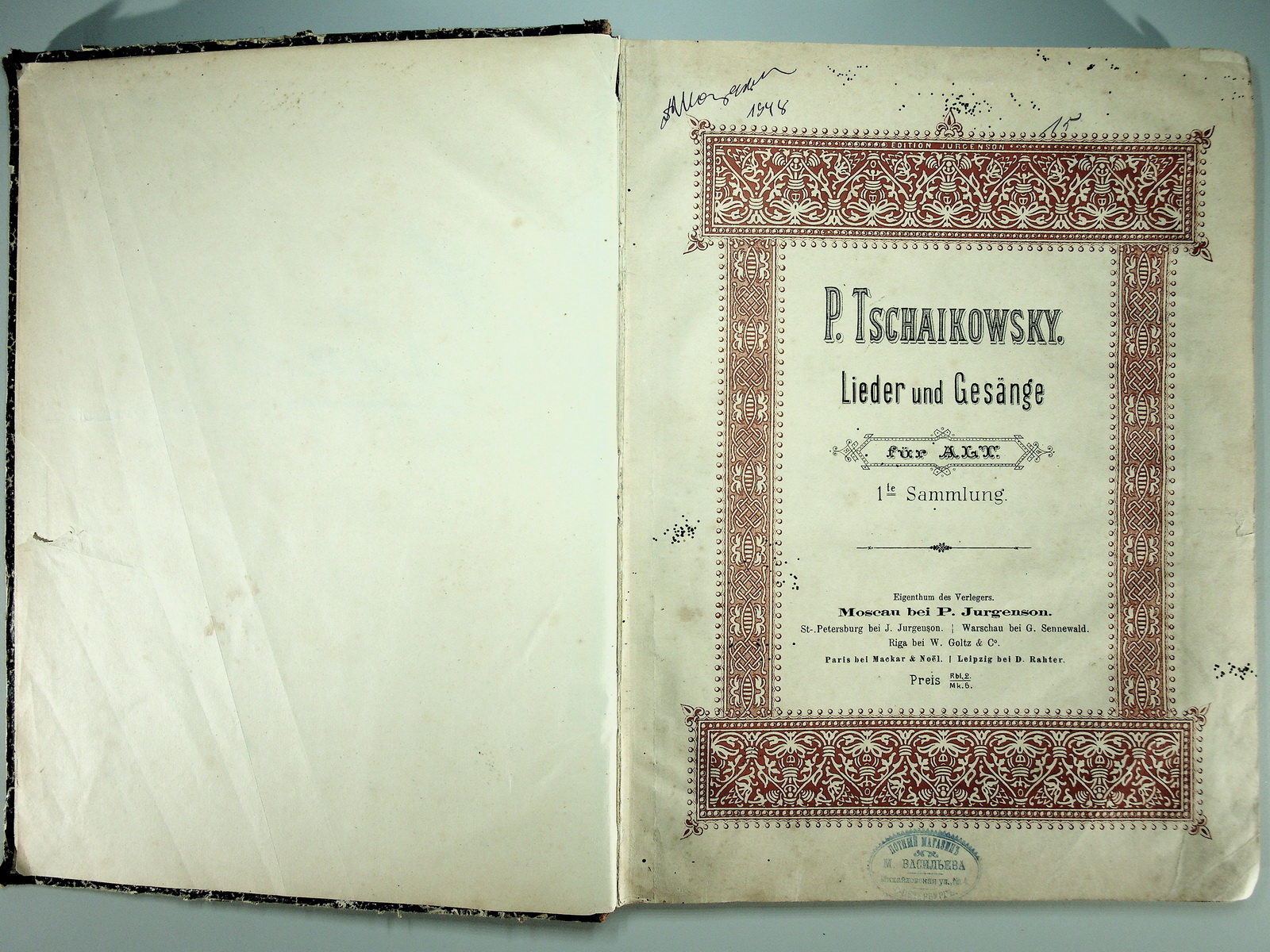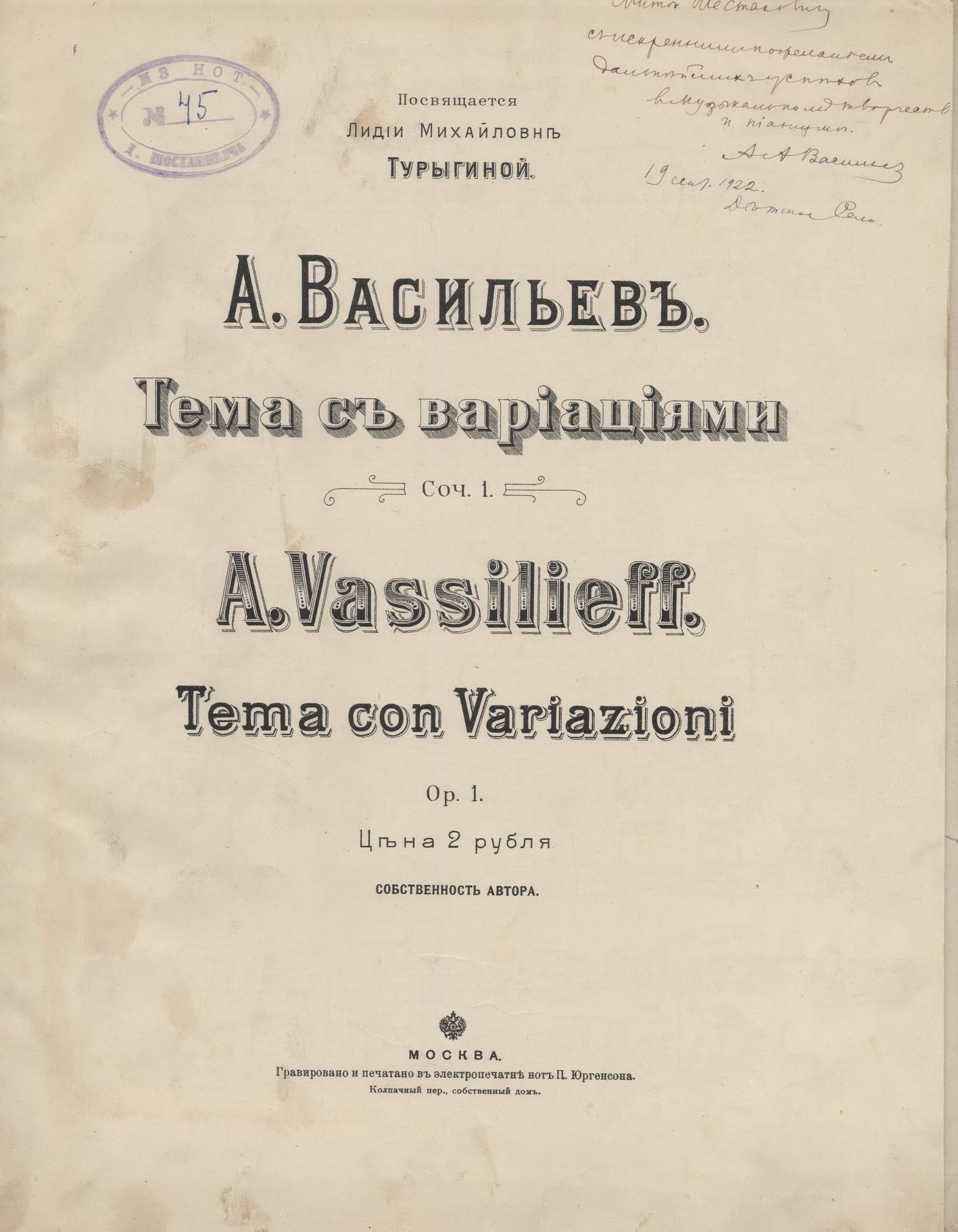 A. A. Vasiliev. Convolute book: Theme and Variations for Piano; “Lullaby”, “In a cozy corner ...” for voice and piano. Moscow. P. Jurgenson Publishing House, without a date.