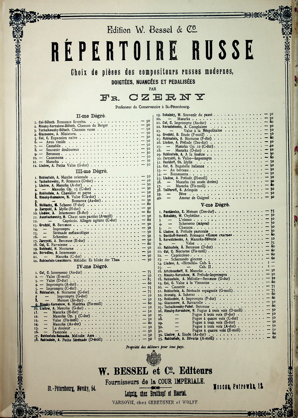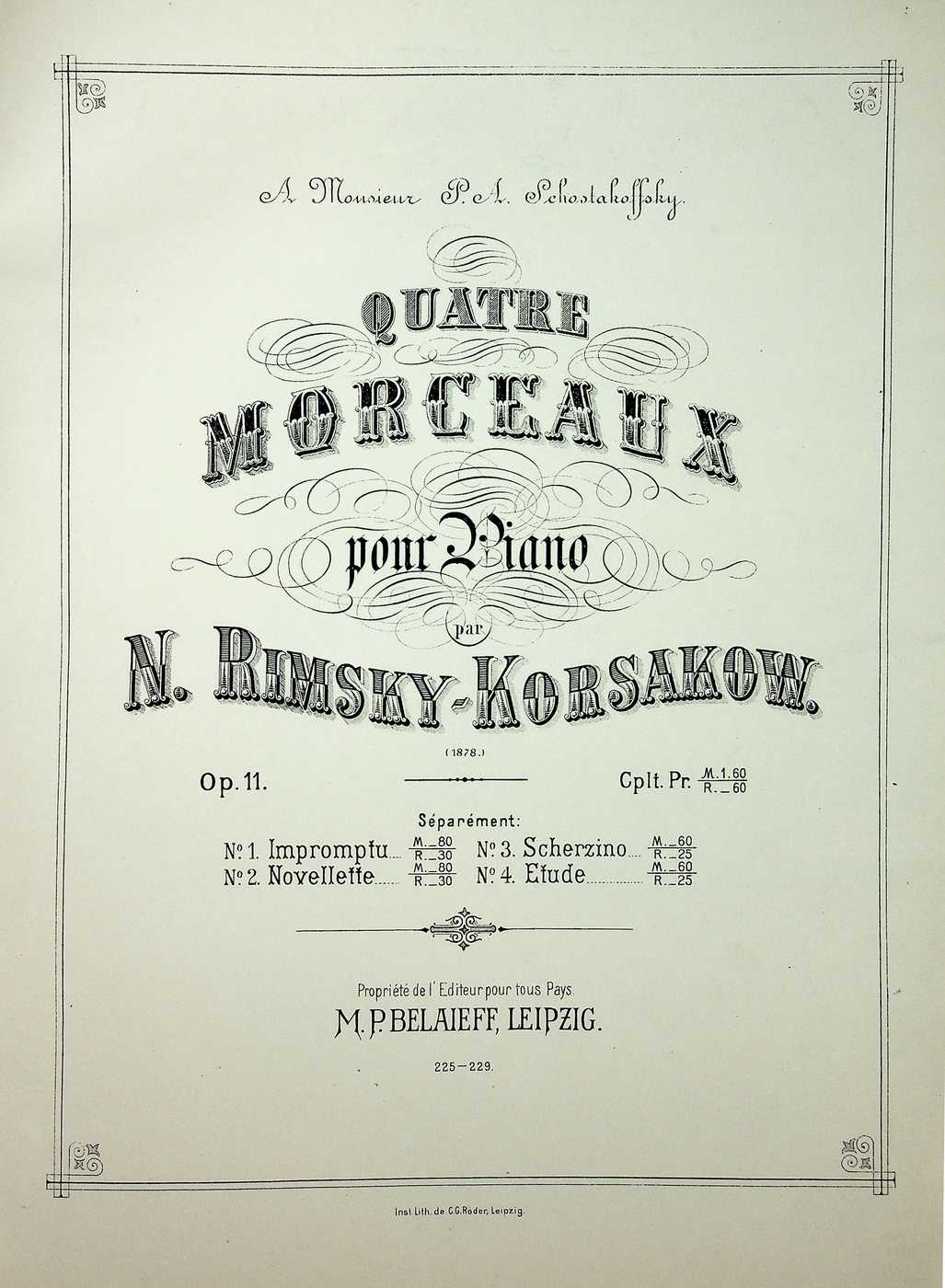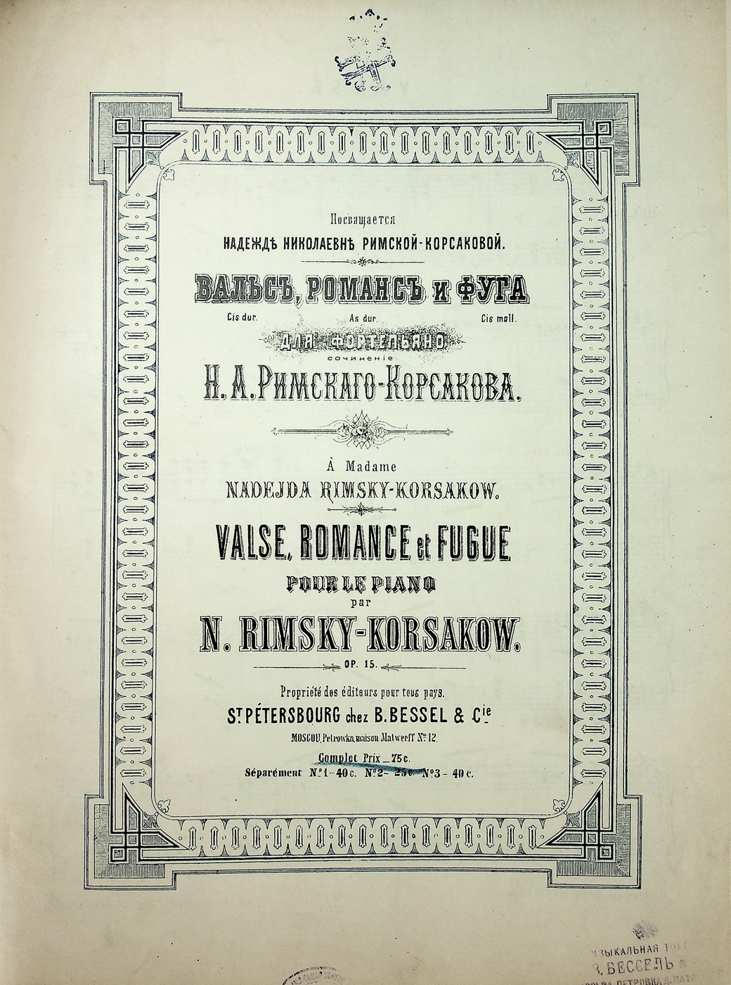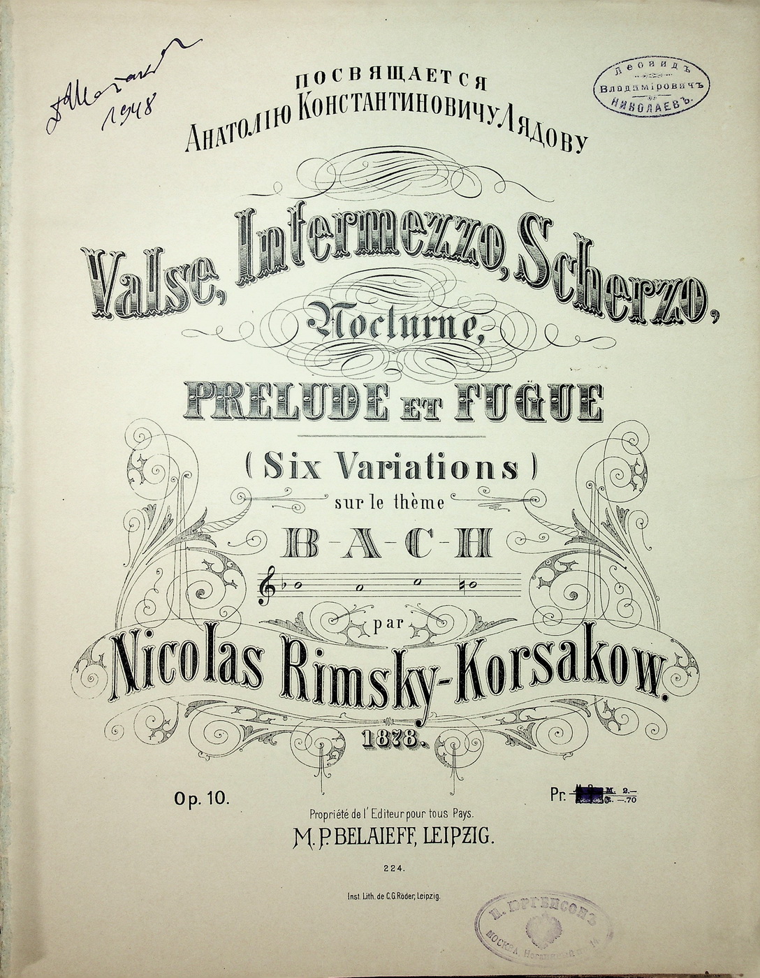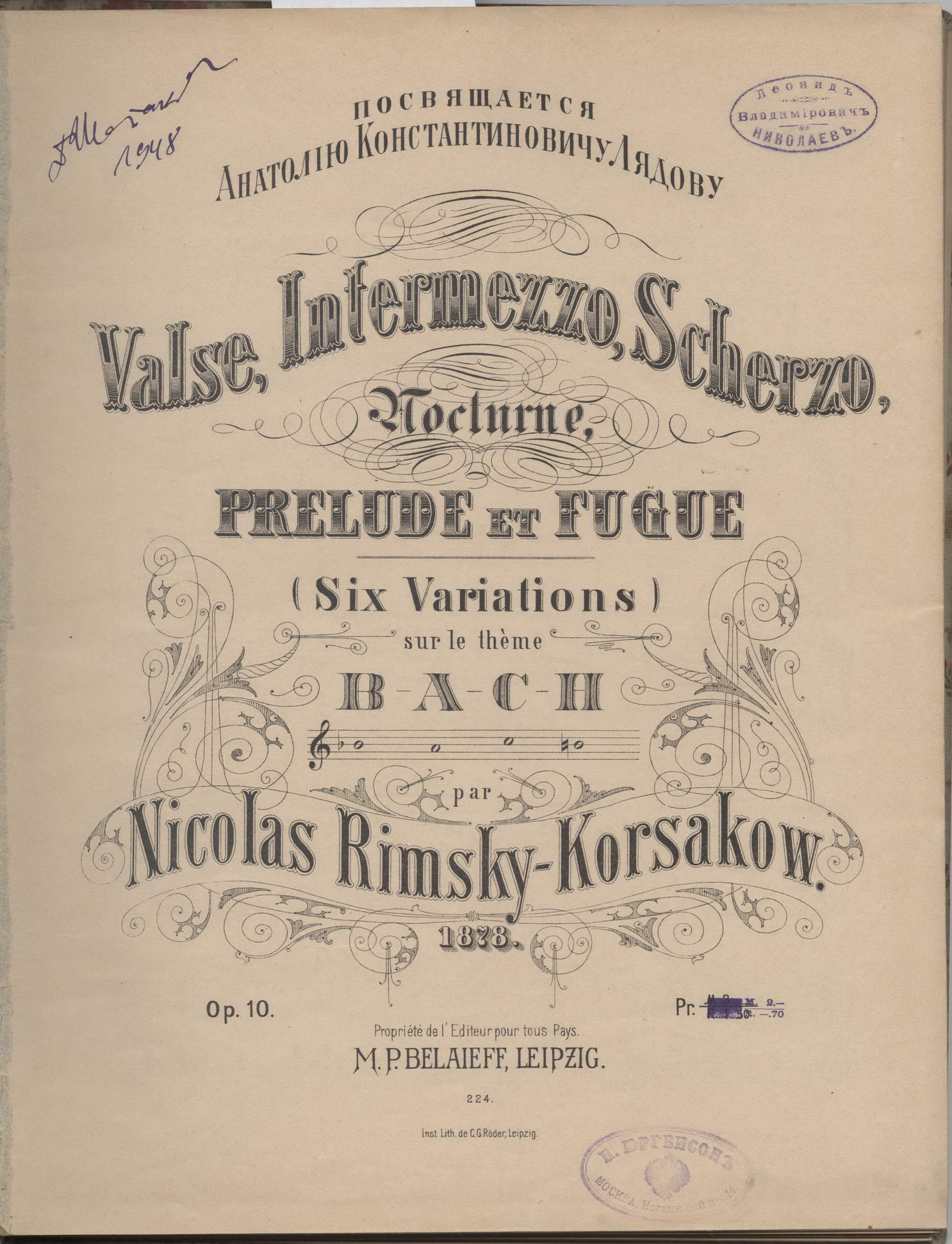 Convolute book: N. A. Rimsky-Korsakov. Works for piano: Variations on the theme “BACH”, 4 pieces, op. 11, Waltz, Romance, Fugue Op. 15, Six Fugues, Concerto cis-moll for piano and orchestra arranged for 2 piano and other works. Publishing house M. P. Belaieff. Leipzig. 1895.