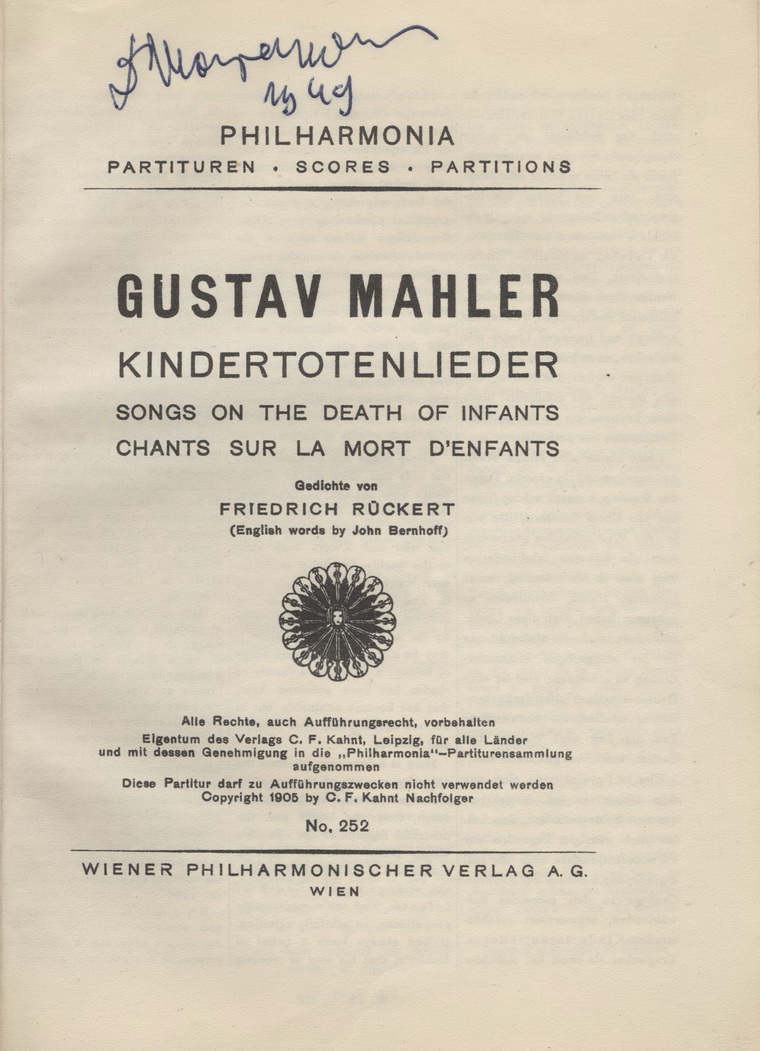 “Songs on the Death of Children” for voice and orchestra by Gustav Mahler. Score. Publishing house of the Vienna Philharmonic Society. Vein. Austria. 1904.