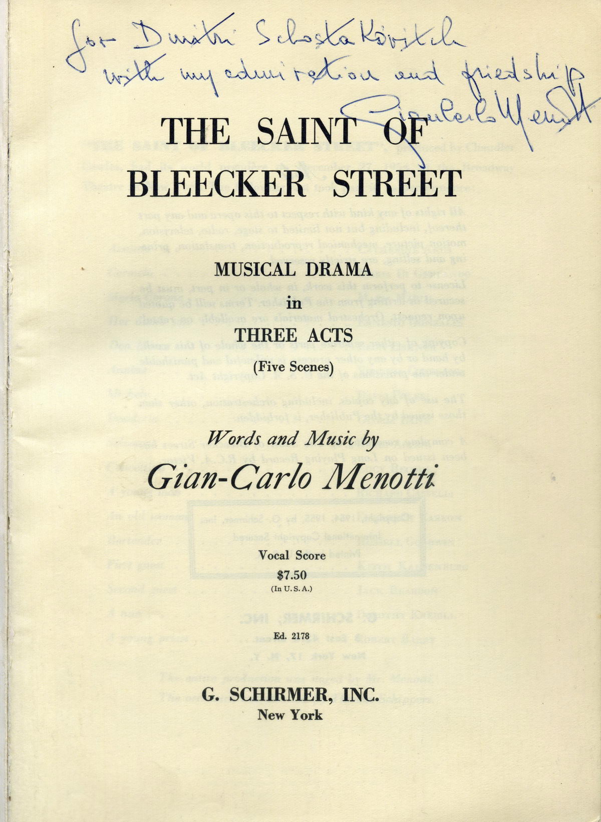 With a dedication: “To Dmitry Shostakovich with my admiration and friendship. Gian-Carlo Menotti.”