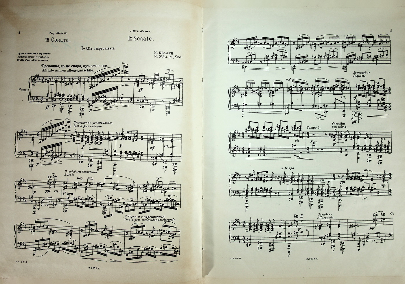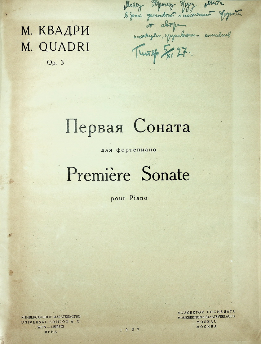 Mikhail Quadri. First Piano Sonata. Op. 3. State Music Publishing House Moscow - Universal Edition Vienna, 1927.
