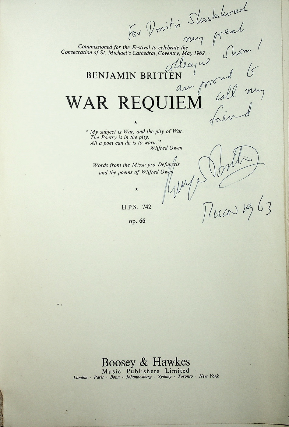 Gift inscription: “For Dmitry Shostakovich, my [real] colleague, whom I am proud to call my friend. Benjamin Britten. Moscow. 1963.”