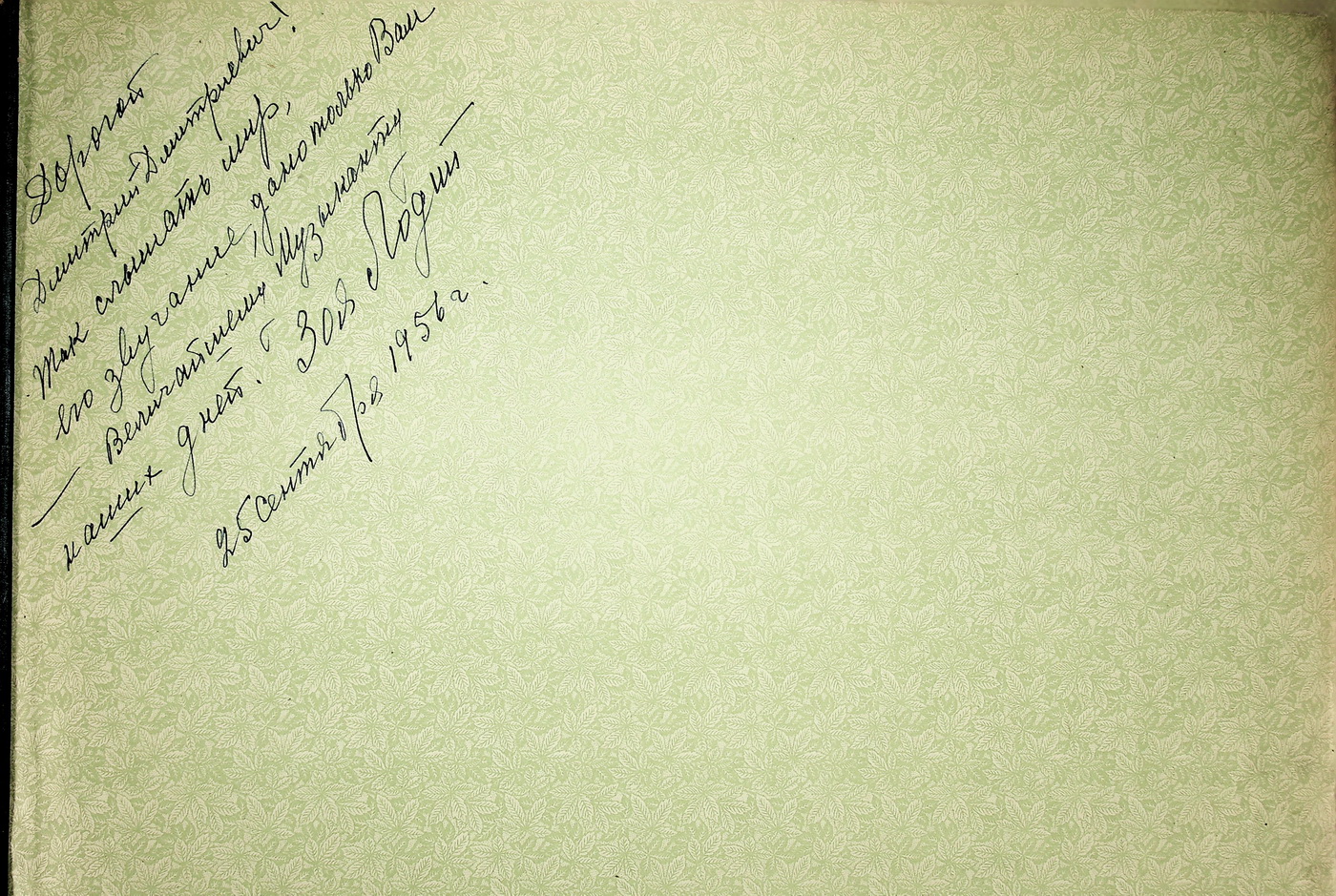Dedicatory inscription: “Dear Dmitri Dmitriyevich, only you, the greatest musician of our time, have such an ear for the world and the way it sounds”, Zoya Lodi, 25 September 1956.