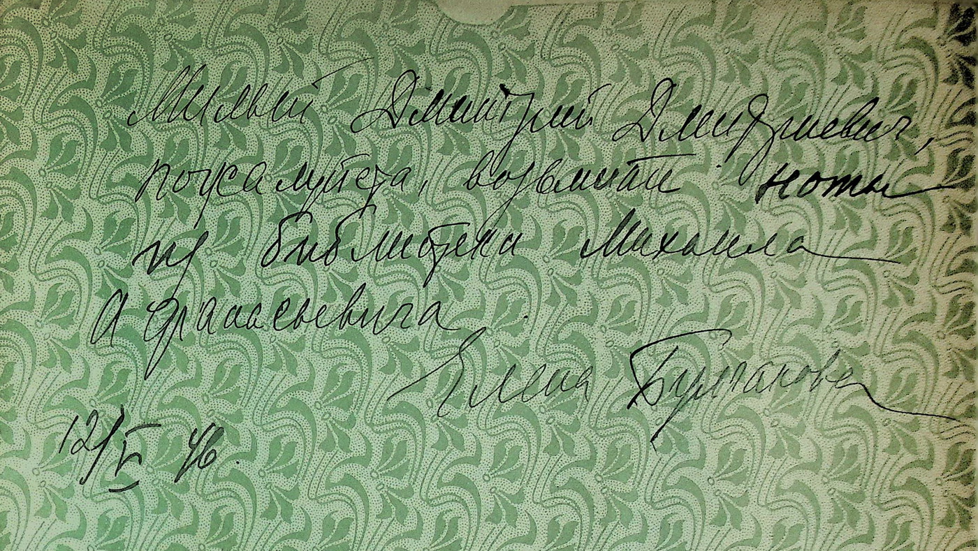 Dedicatory inscription by Yelena Bulgakova: “Dear Dmitri Dmitriyevich, please accept this music from Mikhail Afanasyevich’s library. 12 May 1946”.