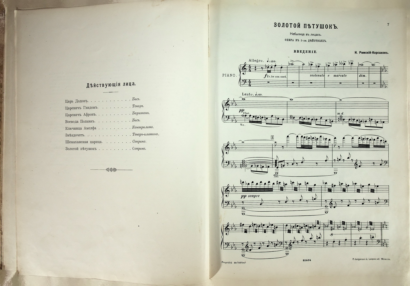Nikolay Rimsky-Korsakov, The Golden Rooster, An Animated Tale, Opera, Arranged for voice and piano, Peter Jürgenson Publishers, Мoscow,1908.