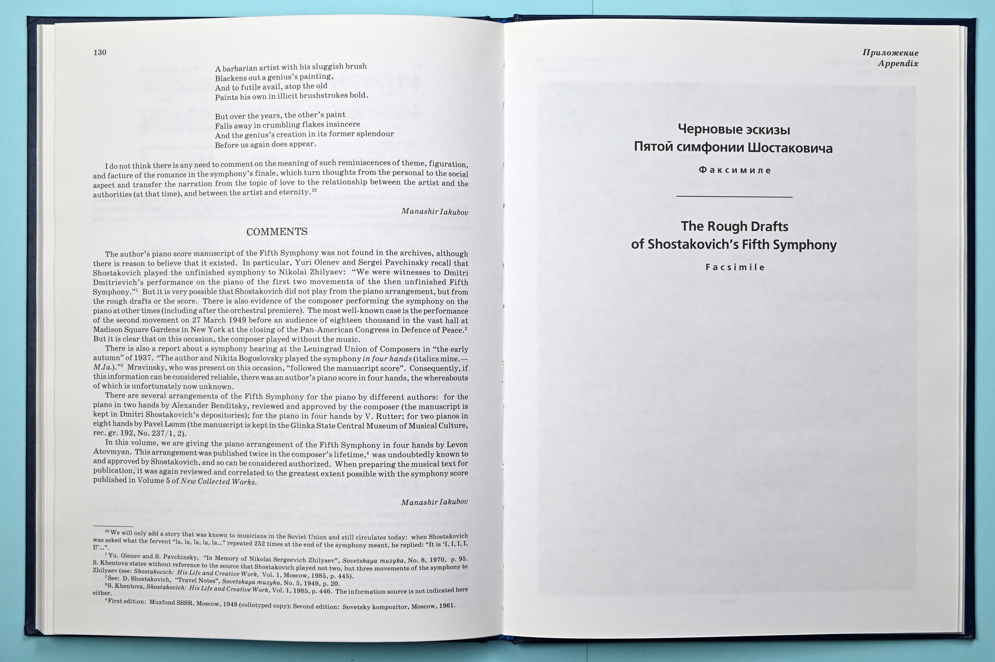 В настоящем томе публикуется переложение Пятой симфонии для фортепиано в 4 руки, выполненное Л. Т. Атовмяном. Это переложение дважды издавалось при жизни композитора, было, несомненно, ему известно, им одобрено и может, таким образом, считаться авторизованным. При подготовке текста к изданию он был заново пересмотрен и приведён в максимальное соответствие с партитурой симфонии, опубликованной в томе 5 Нового собрания сочинений.