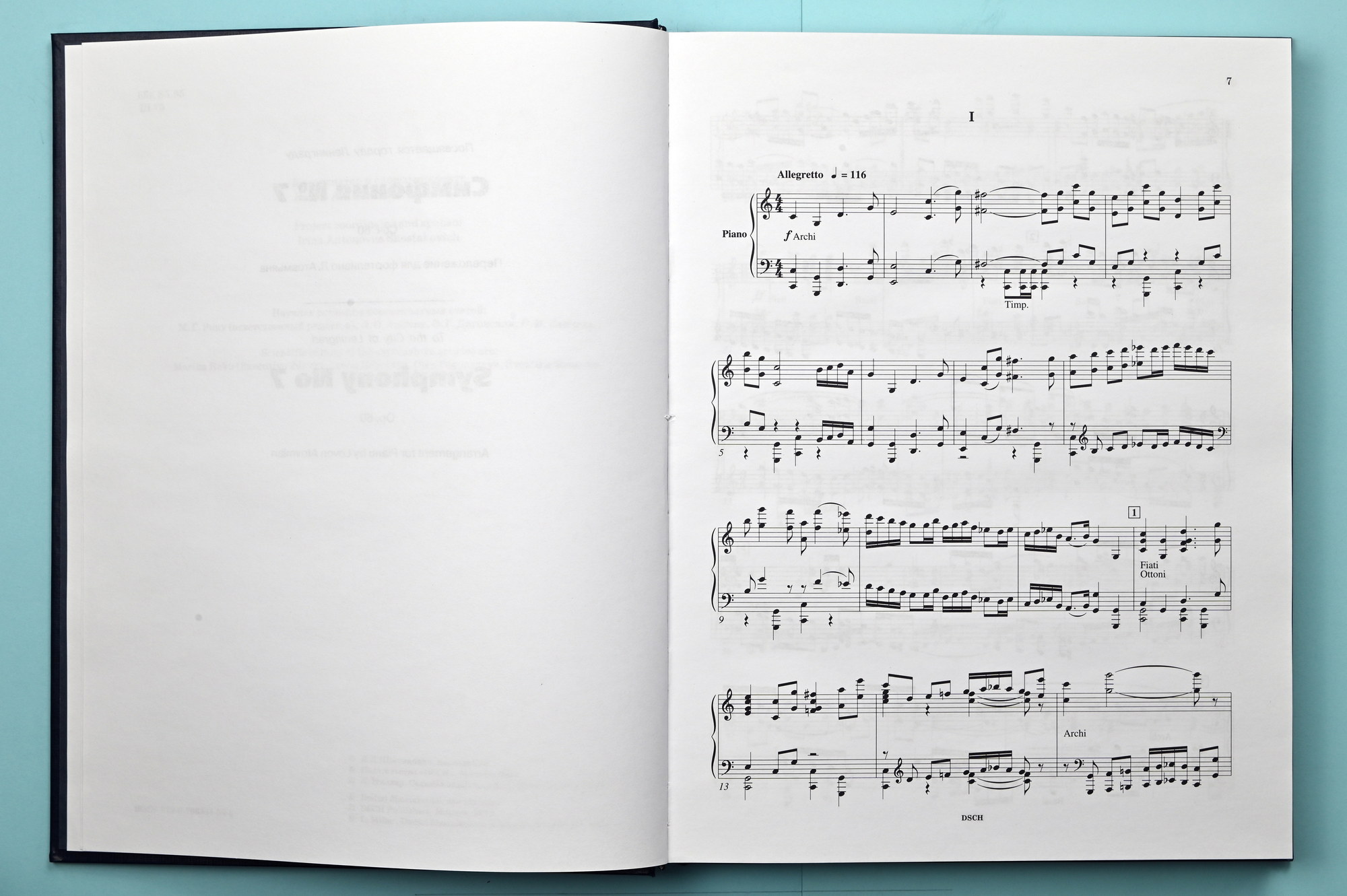 Переложение симфонии и подготовка его к публикации шли одновременно с изданием партитуры. Шостакович сделал четырёхручное переложение только финала симфонии (вероятно, для первых репетиций). В клавире финала, помимо уточняющих исполнительских помет, внесённых Шостаковичем, содержатся как авторские надписи, так и надписи неустановленного лица, связанные с подготовкой переложения для фортепиано. Шостаковичем выписаны некоторые указания («октавы», «л[евая] р[ука]», «октавы в левой руке»), схематично, тем же карандашом, волнистой линией, переходящей из одного нотного стана к другому, показано расположение материала. Не почерком композитора уточняются фактура, расположение аккордов и другие детали распределения текста. Возможно, часть этих надписей былавыполнена Л. Т. Атовмьяном, которому Шостакович доверил работу над четырёх- и двухручным переложениями Седьмой симфонии.