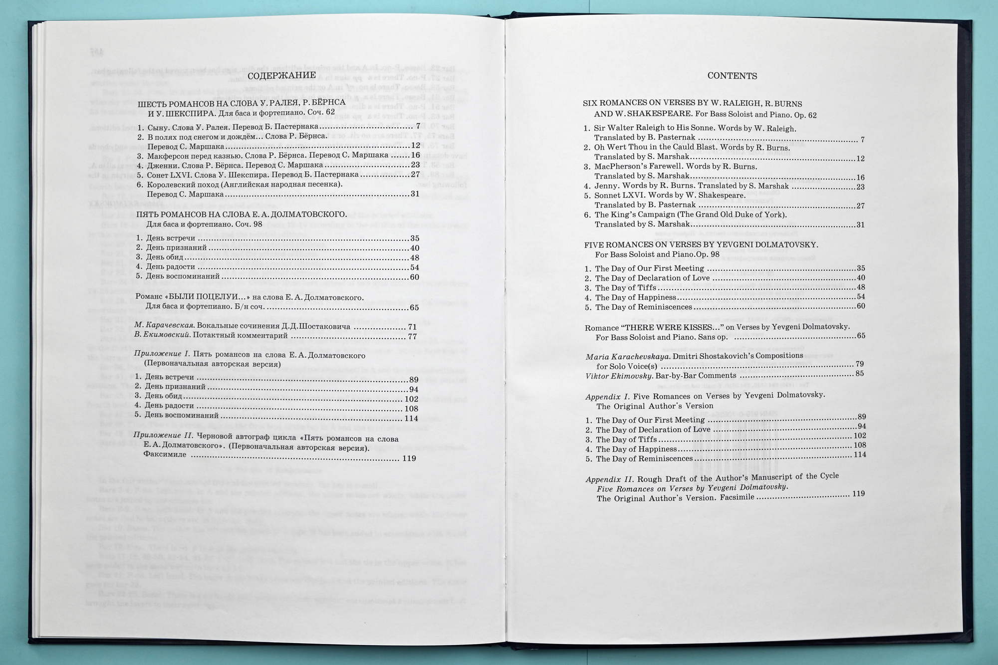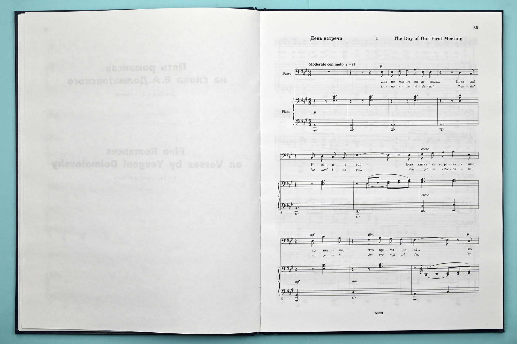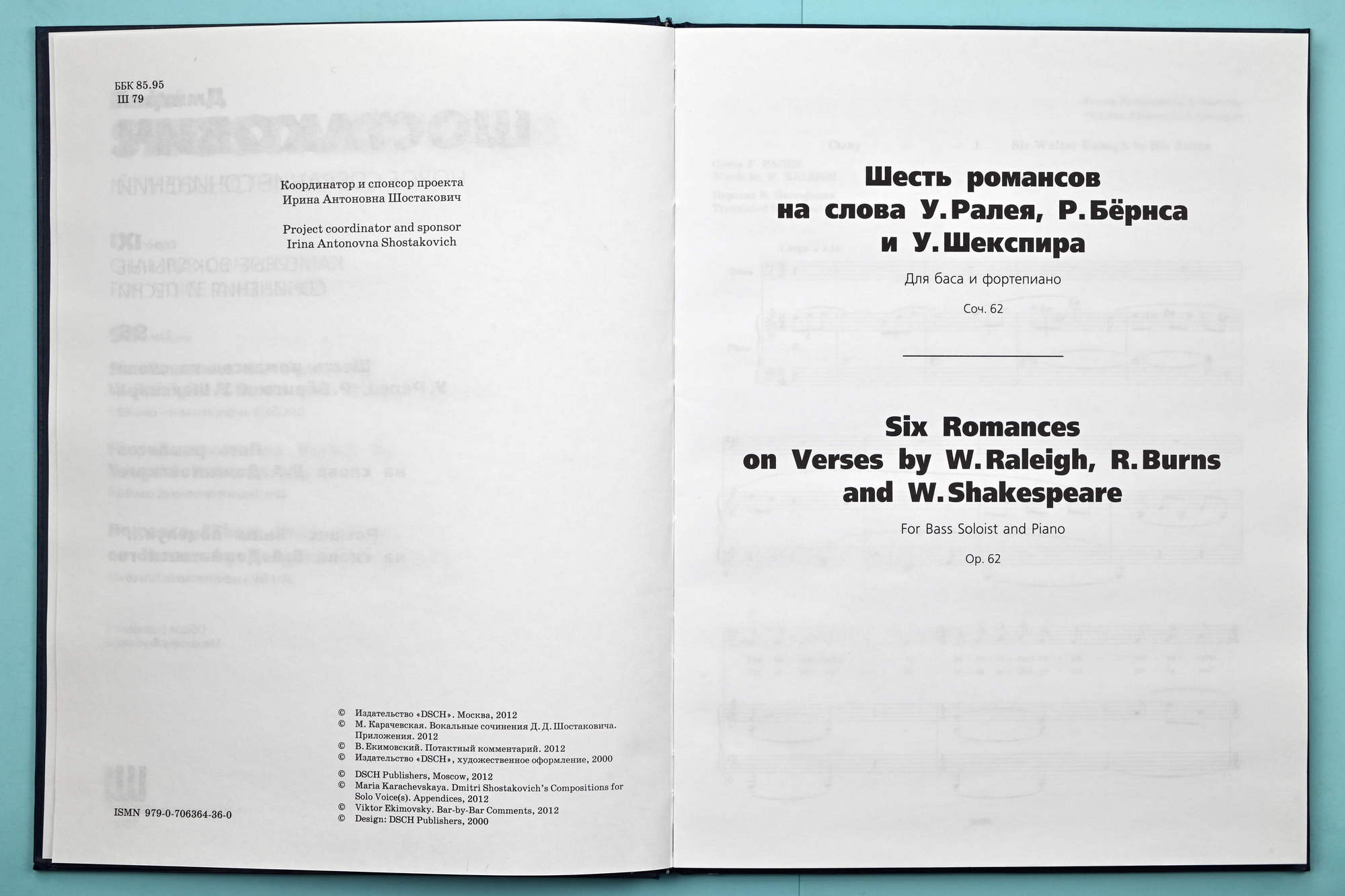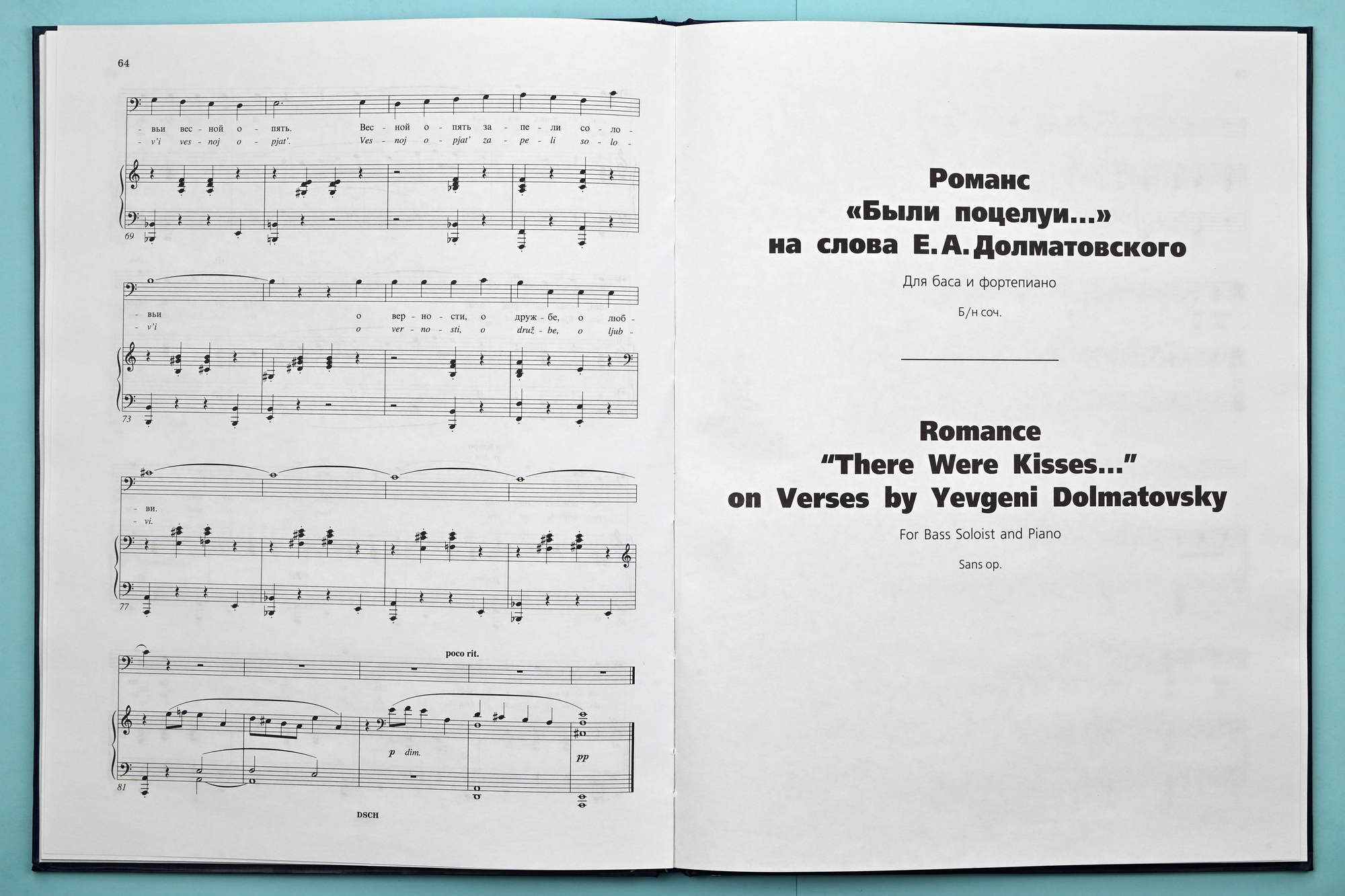 Шесть романсов на слова У. Ралея, Р. Бёрнса и У. Шекспира. Соч. 62. Пять романсов на слова Е. Долматовского. Соч. 98. «Были поцелуи...» на слова Е. Долматовского. Б/н соч. Для баса и фортепиано.