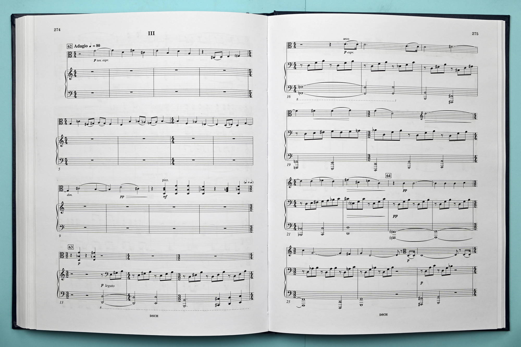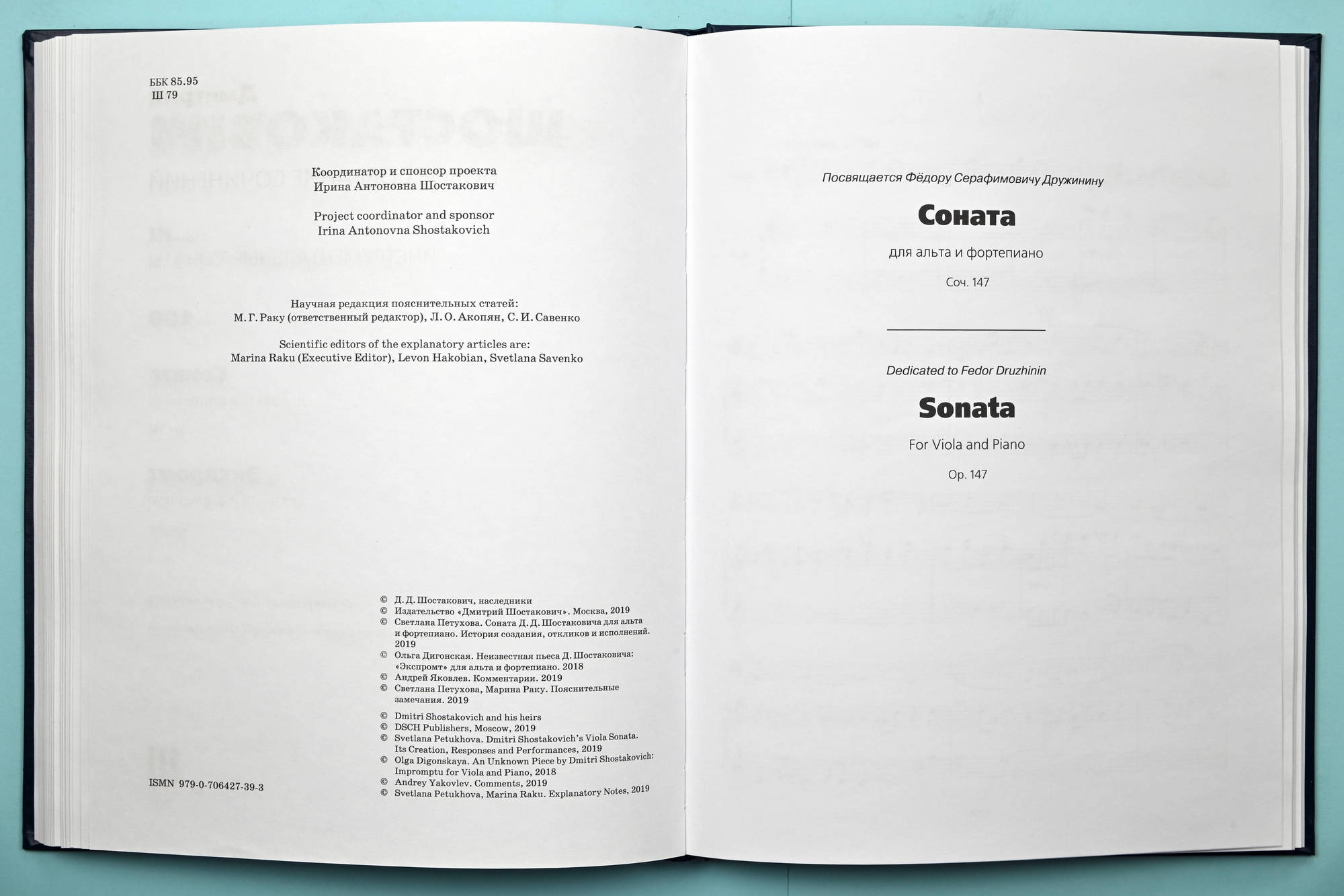 This publication of the Viola Sonata is based on the edition of the Sonata in Volume 38 of Dmitri Shostakovich’s Collected Works—Muzyka Publishers, Moscow, 1982 (E). The following sources are referred to: the author’s manuscript of the Sonata (A) and the collotype edition of the work that predates all the printed publications, issued by the USSR Muzfond in 1975 (C). In a number of disputable episodes, the following sources are referred to: the viola part (a separate notebook) edited by Fedor Druzhinin and included in E (EP), as well as the viola part of C (CP).