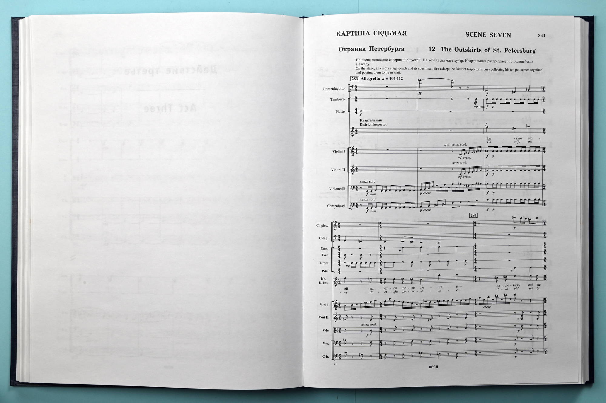 A satirical opera in three acts, for chamber orchestra (with 2 harps, piano, flexatone, domras, and balalaikas), S.A.T.B. chorus, and 82 singing/speaking parts.