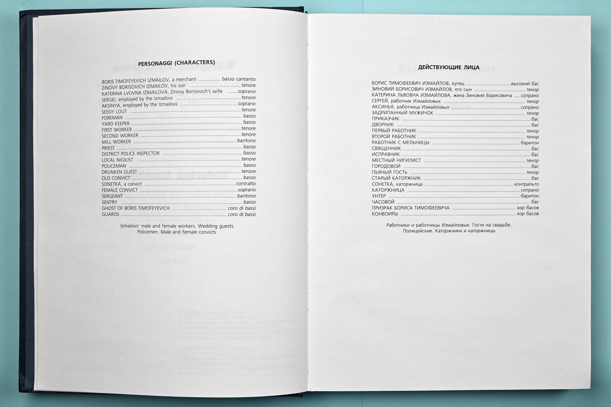 Libretto by Alexander Preys and Dmitri Shostakovich based on the novel-sketch by Nikolai Leskov 'Lady Macbeth of the Mtsensk District' Op. 29/114. Version of 1963 year.