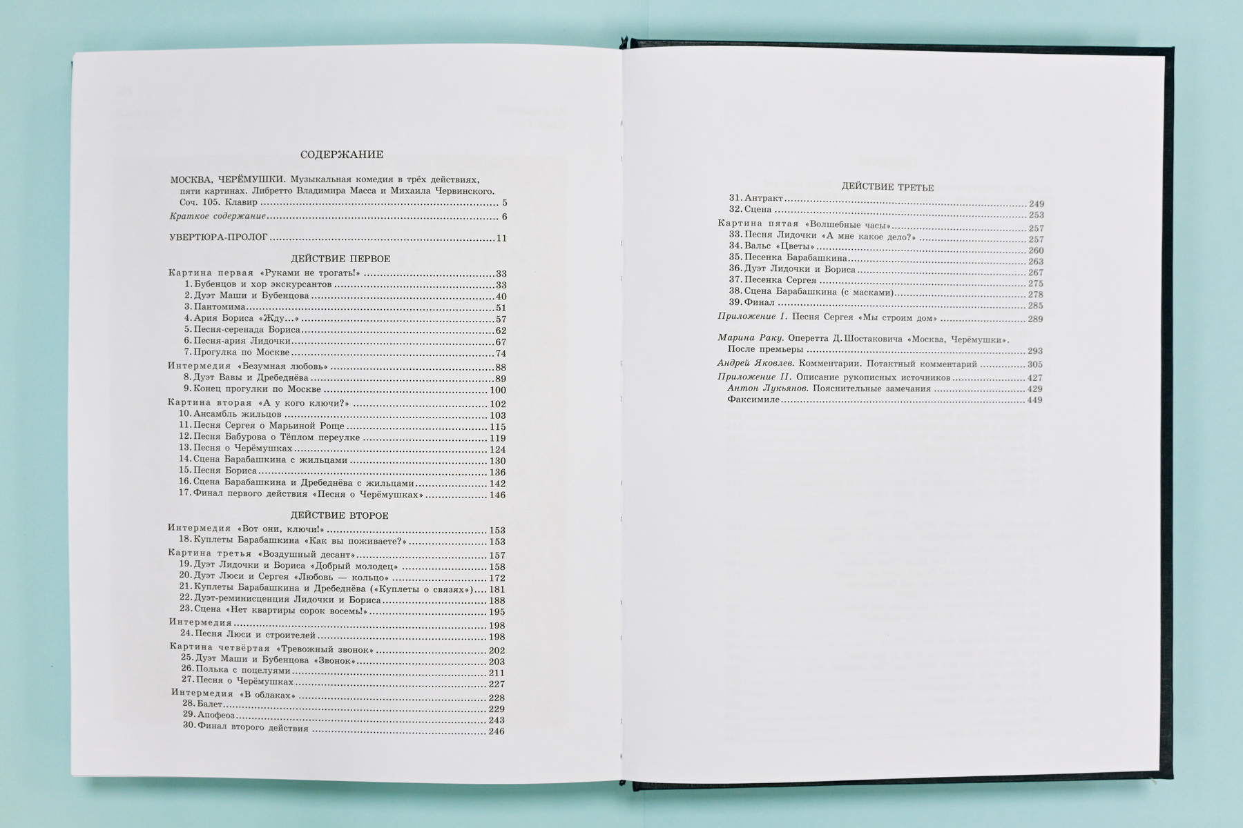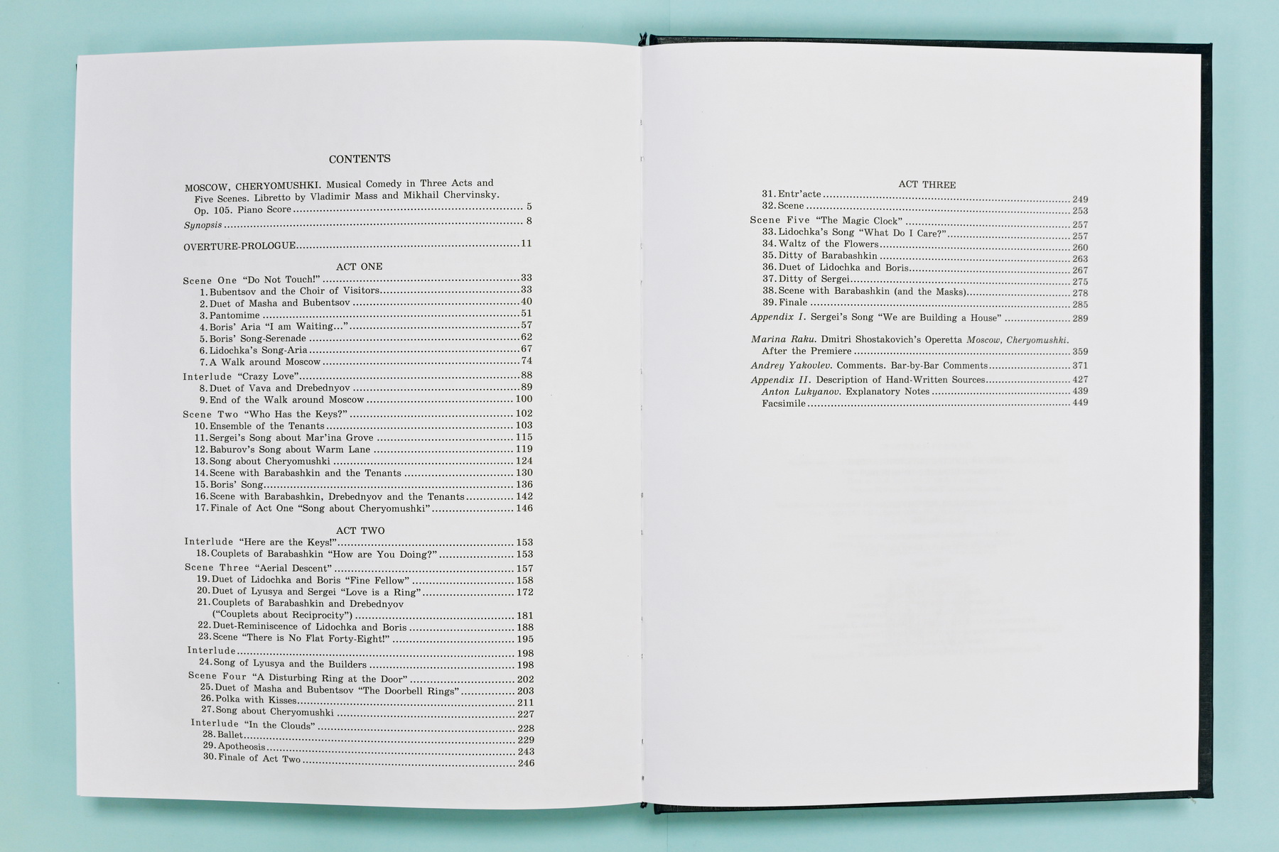 This edition is based on the publication of the piano score of the musical comedy Moscow, Cheryomushki in Vol. 25 of Dmitri Shostakovich’s Collected Works, Muzyka Publishers, Moscow, 1986 (PS), as well as the publication of the score of the musical comedy in Vol. 66 of New Collected Works, DSCH, Moscow, 2006 (S). The publication of the score of the musical comedy in Vol. 24 of Collected Works, Muzyka Publishers, Moscow, 1986 (S-86), on which S is based, was also taken into account. In some cases, the manuscripts of individual items of the piano score1 are referred to, as well as the author’s manuscript of the score of an additional item “Sergei’s Song”.