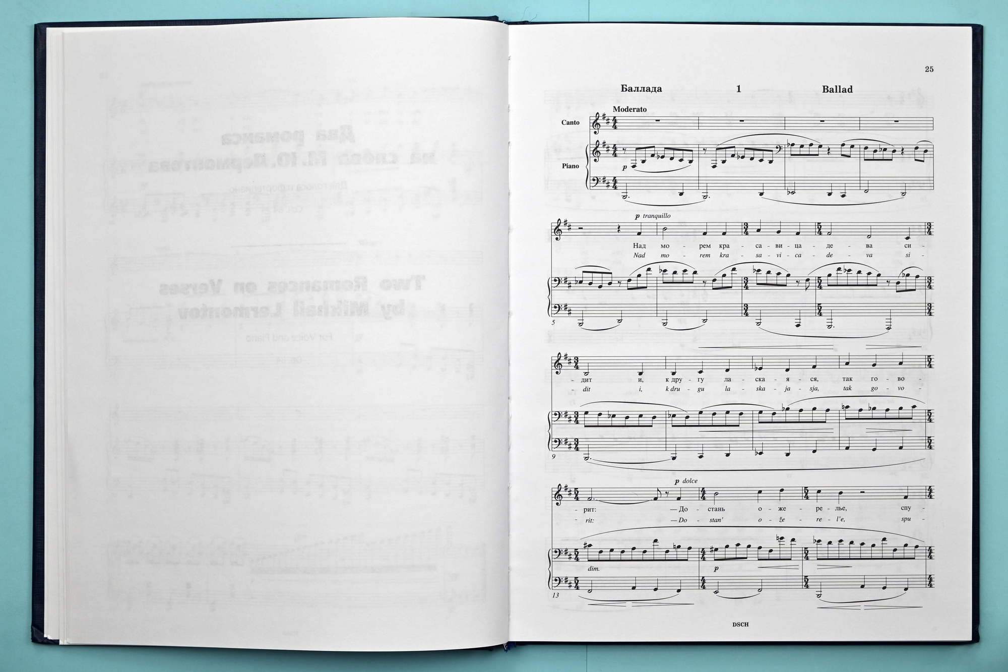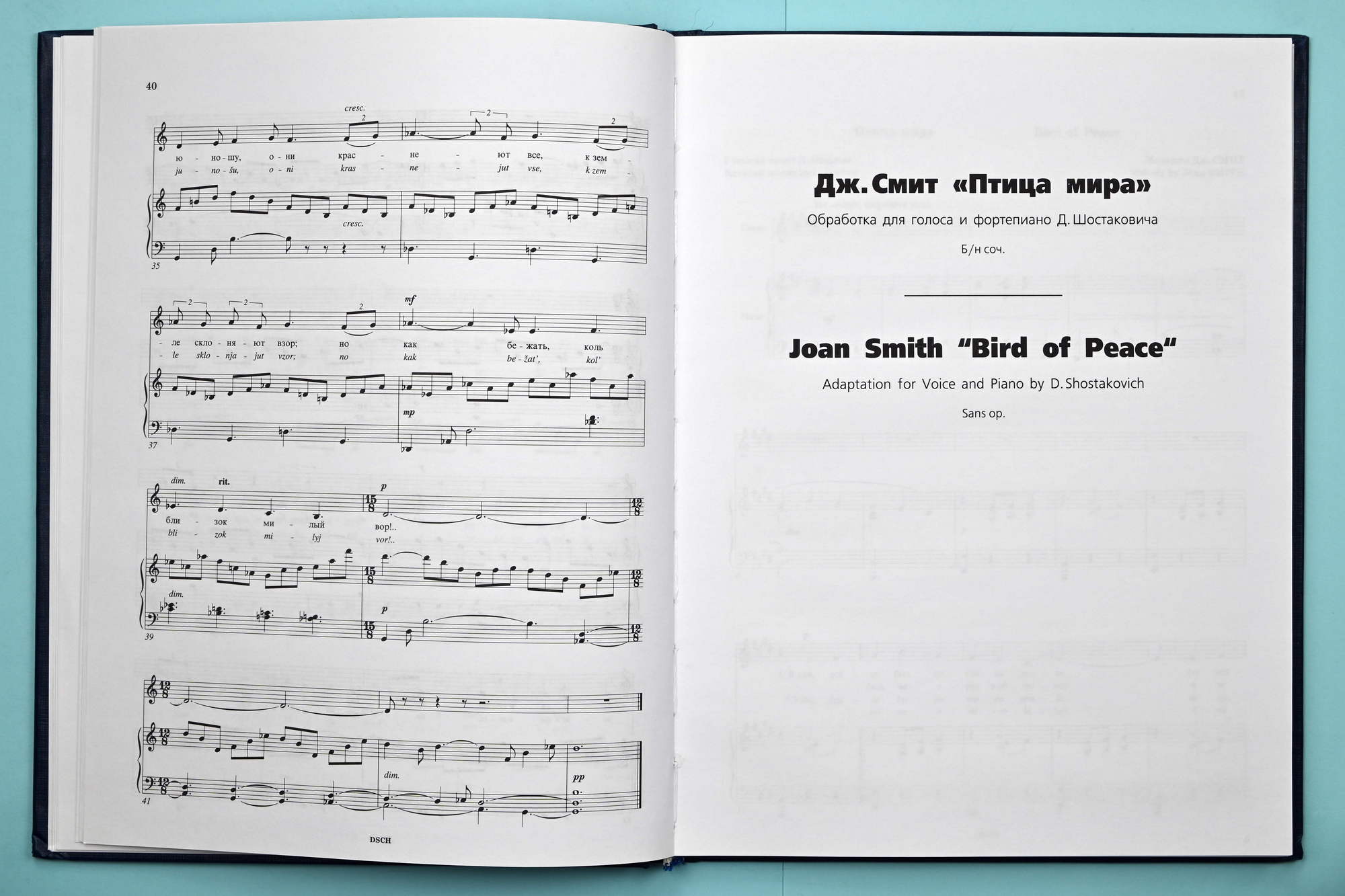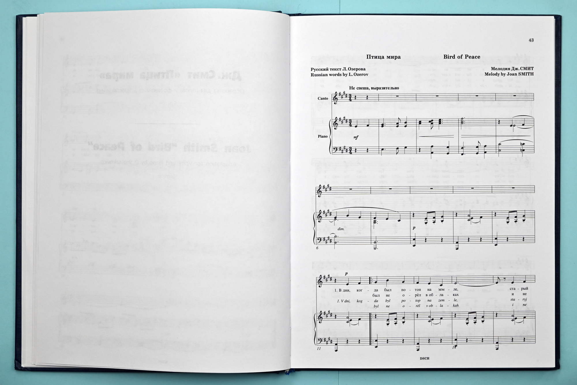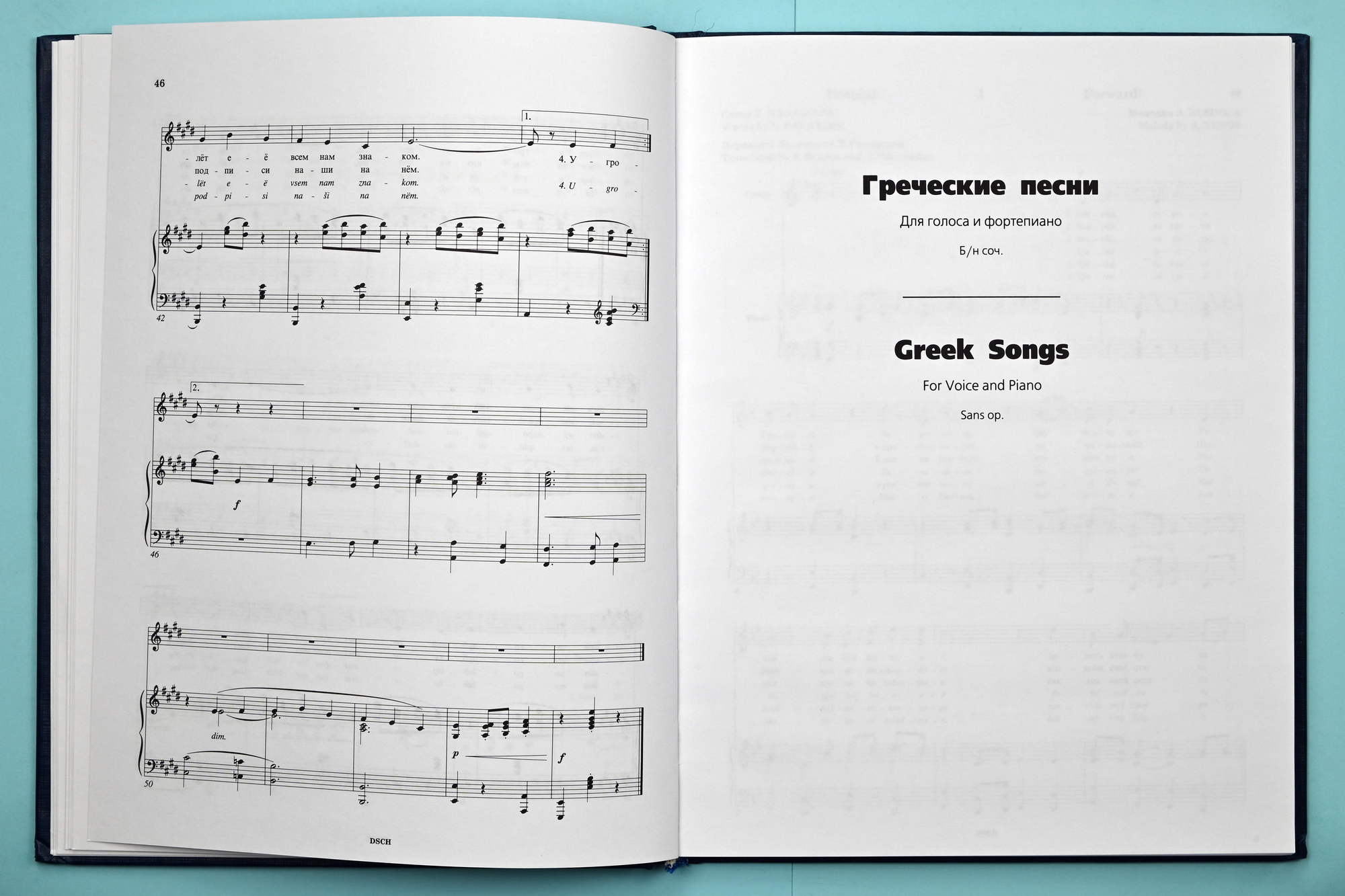 Two Fables by Ivan Krylov. Op. 4. Two Romances on Verses by Mikhail Lermontov. Op. 84. Spanish Songs. Op. 100. Six Songs on Poems by Marina Tsvetayeva. Op. 143. Greek Songs. Sans op. For voice and piano. Joan Smith. “Bird of Peace”. Sans op. Adaptation for voice and piano.