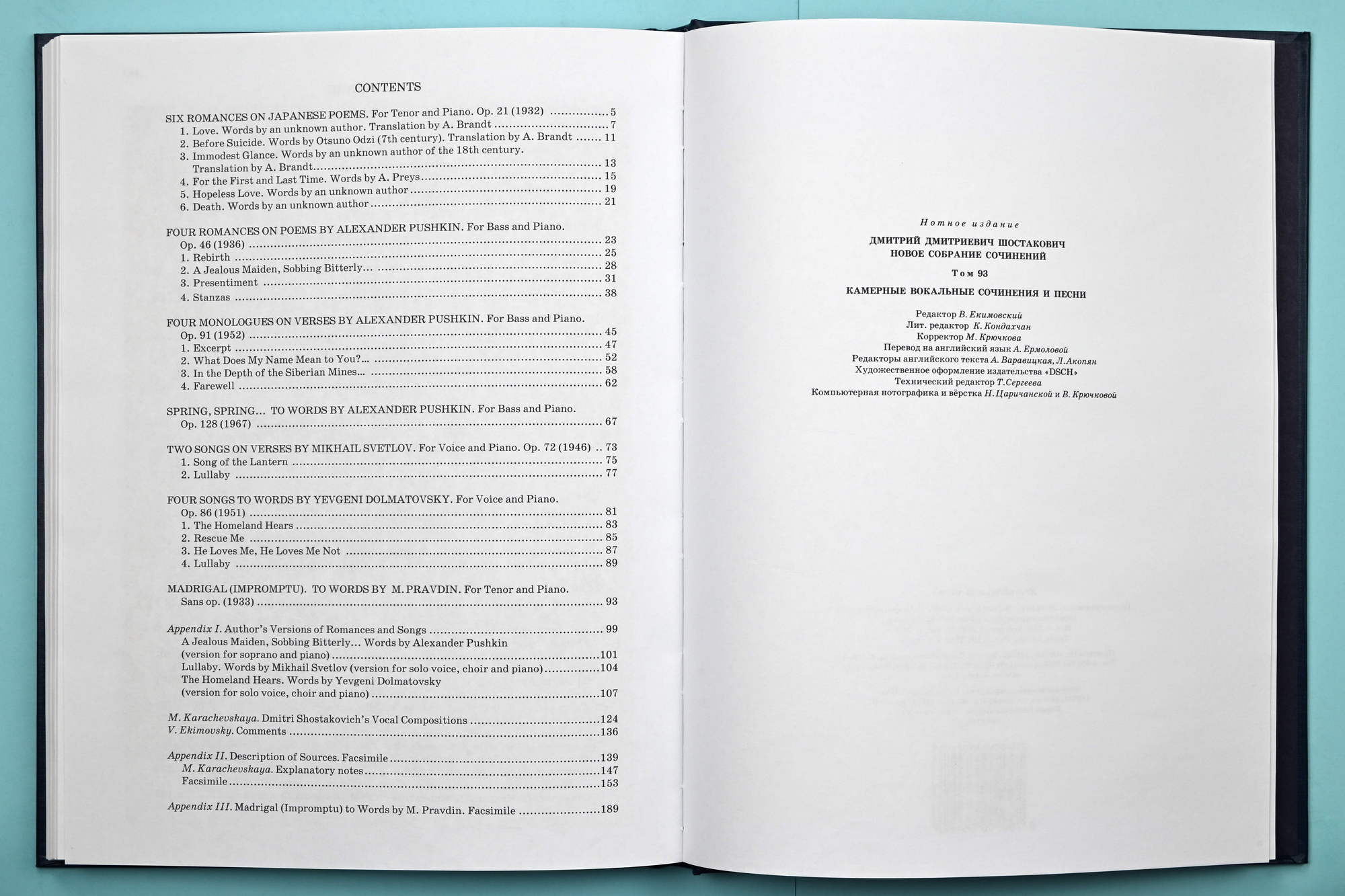 This publication is based on the 1982 edition: D. Shostakovich, Collected Works, Vol. 32, Muzyka Publishers, Moscow, collated with the author’s manuscript kept in Dmitri Shostakovich’s Archive—rec. gr. 1, inv. 1, f. 322 (A). The author’s version of the second romance “A Jealous Maiden, Sobbing Bitterly...” for soprano and piano is printed in Appendix I in accordance with the author’s manuscript kept in RSALA, rec. gr. 2048, inv. 1, f. 48.