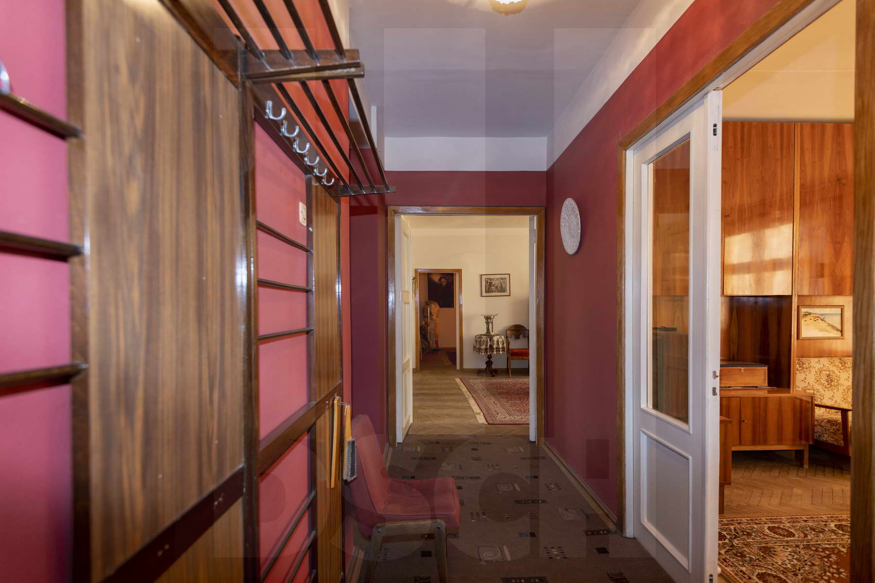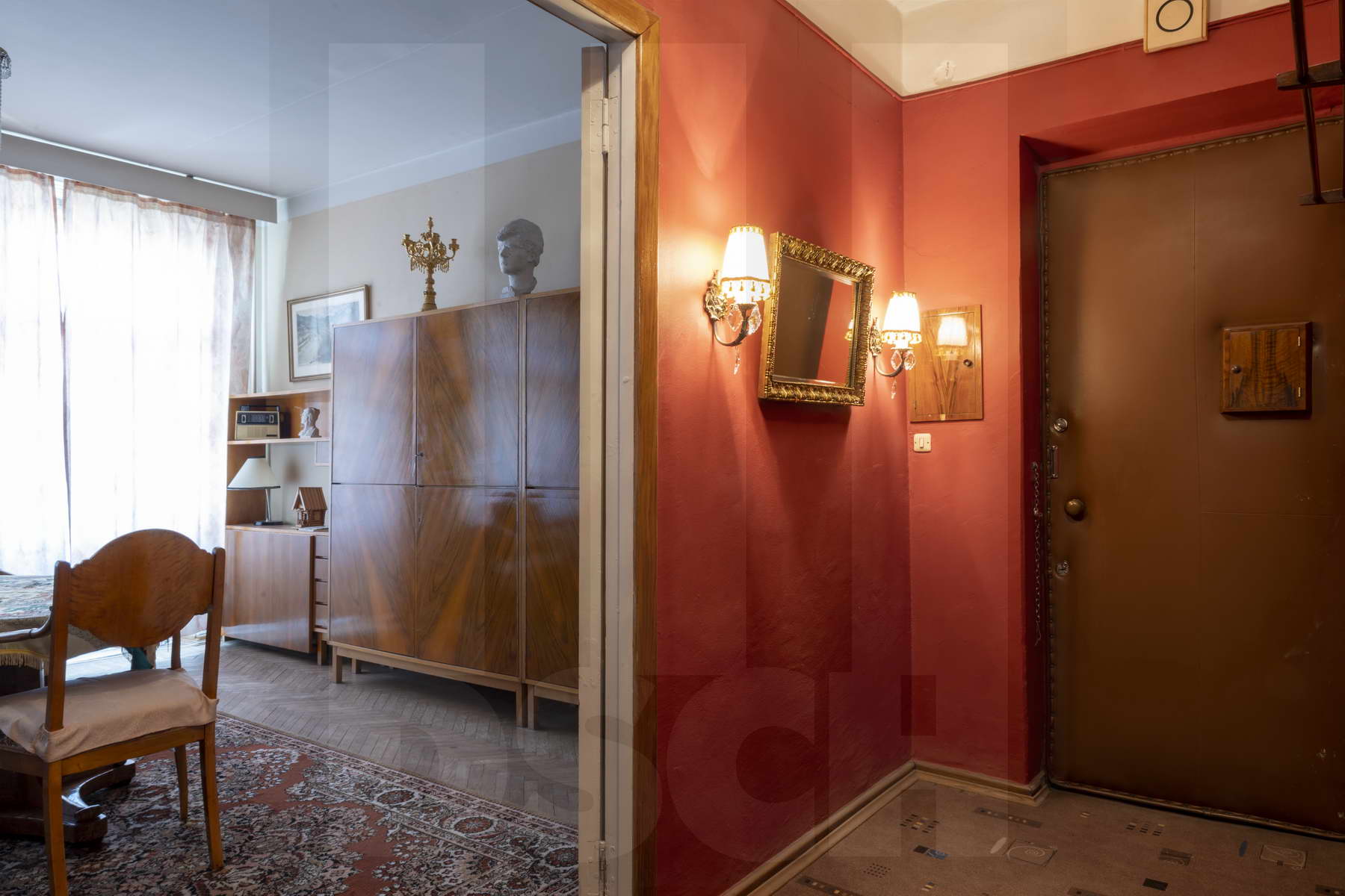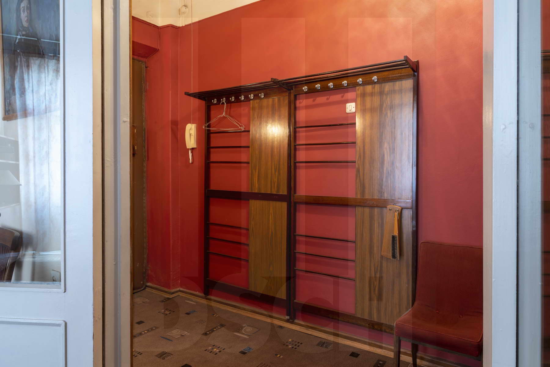 A narrow corridor with the indispensable attributes of an entrance hall—a mirror and a coat rack attached to the wall—leads to the reception room.