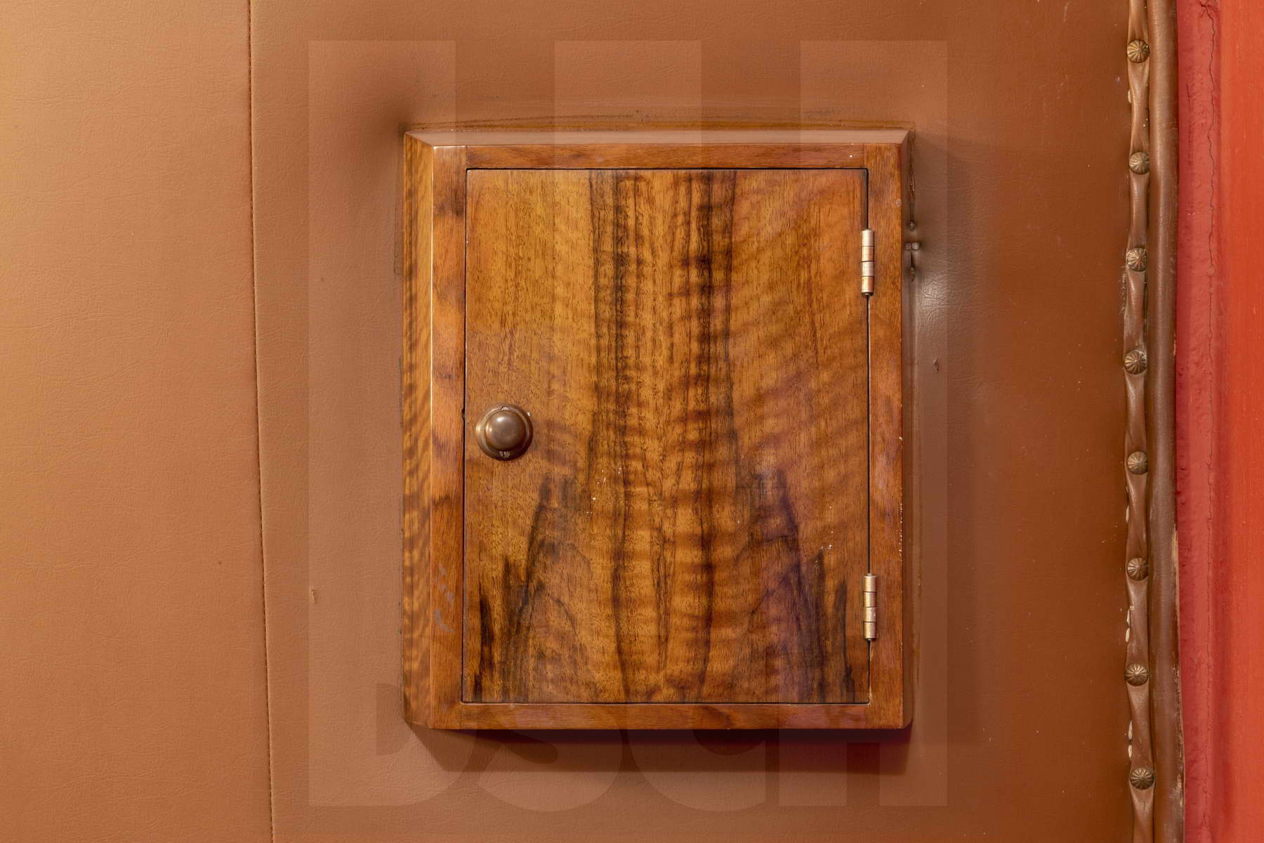 The front door, upholstered in brown leatherette for warmth and soundproofing, is nothing out of the ordinary, just the same as thousands of similar doors in Moscow during the 1960s and 1970s.