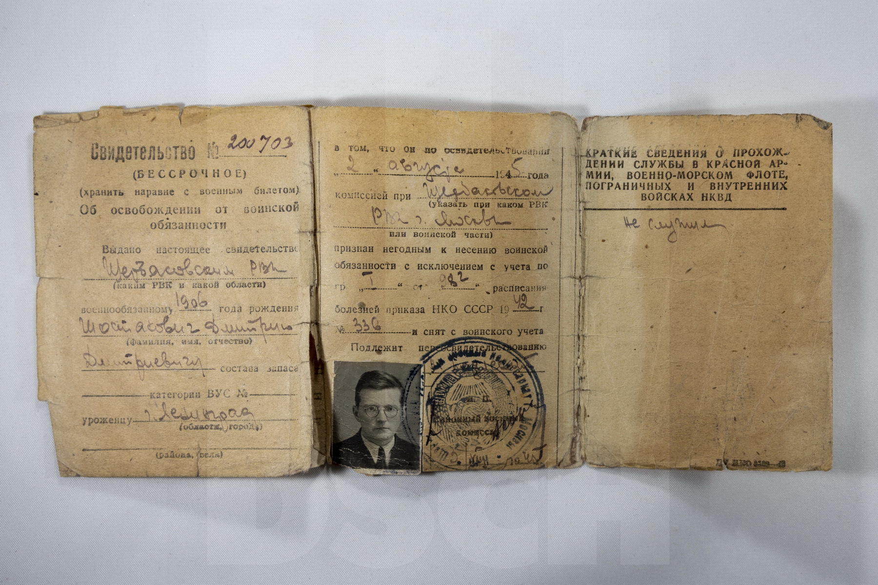 Certificate of exemption from military service. Shostakovich was declared “unfit for military service due to poor eyesight”.