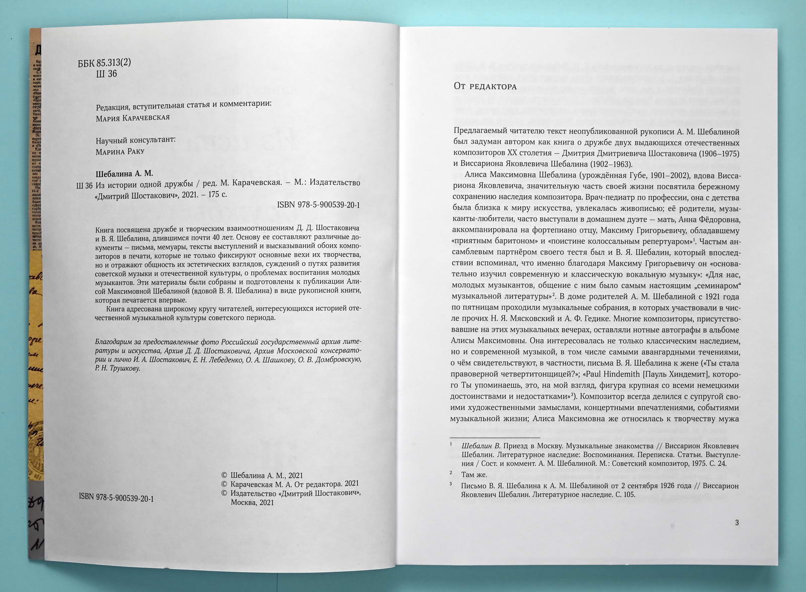 Предлагаемый читателю текст неопубликованной рукописи А. М. Шебалиной был задуман автором как книга о дружбе двух выдающихся отечественных композиторов ХХ столетия — Дмитрия Дмитриевича Шостаковича (1906–1975) и Виссариона Яковлевича Шебалина (1902–1963).