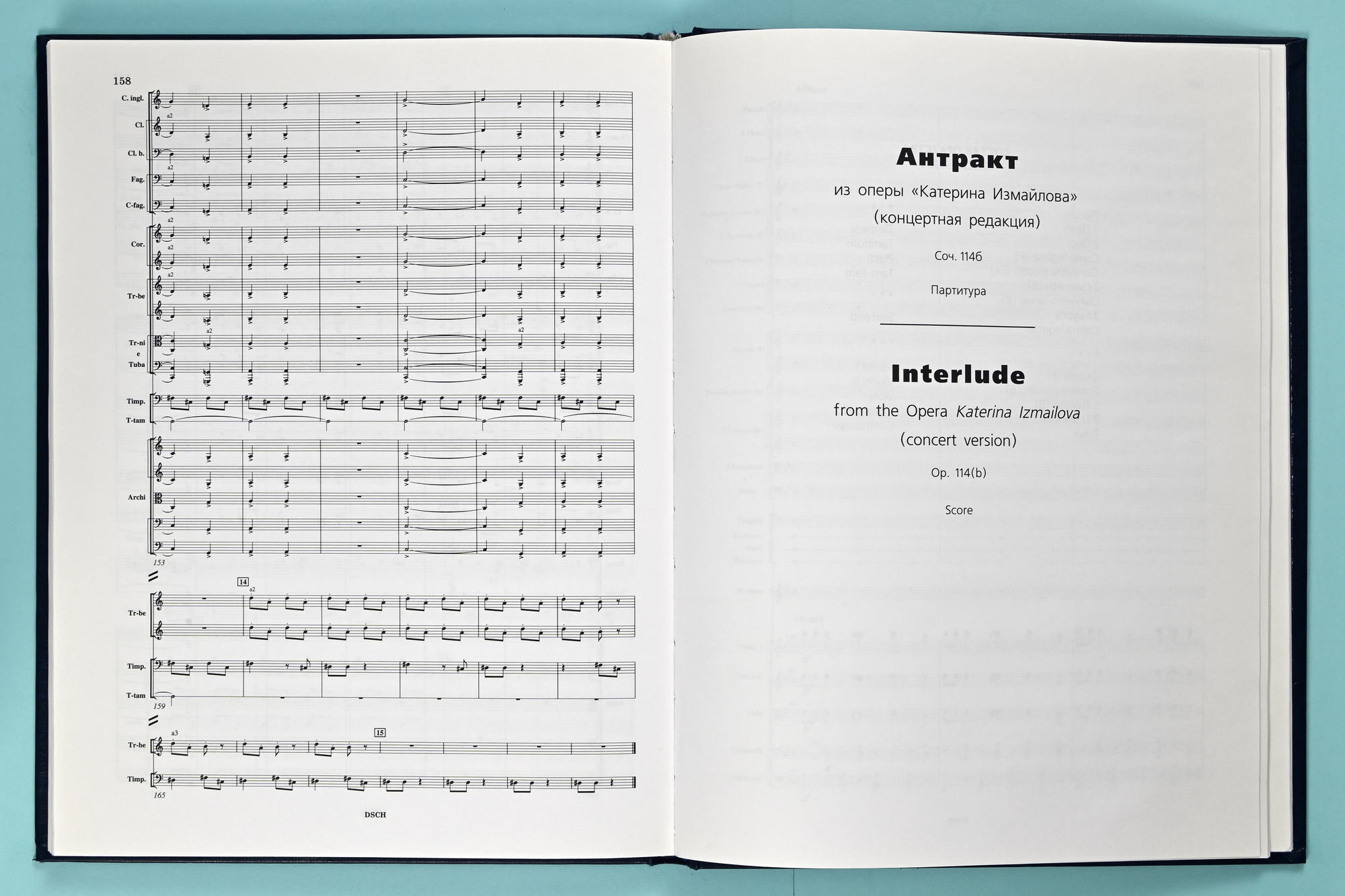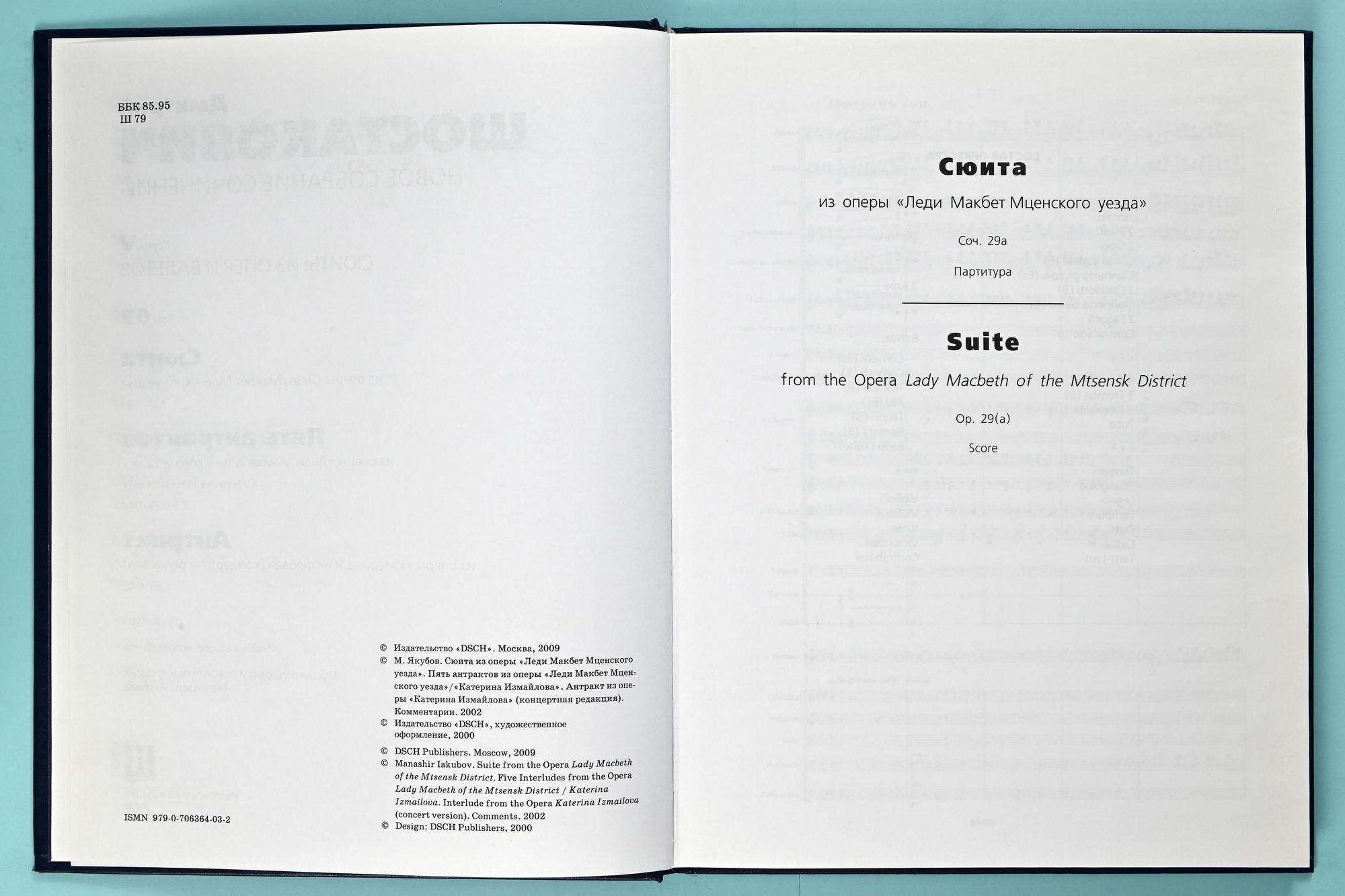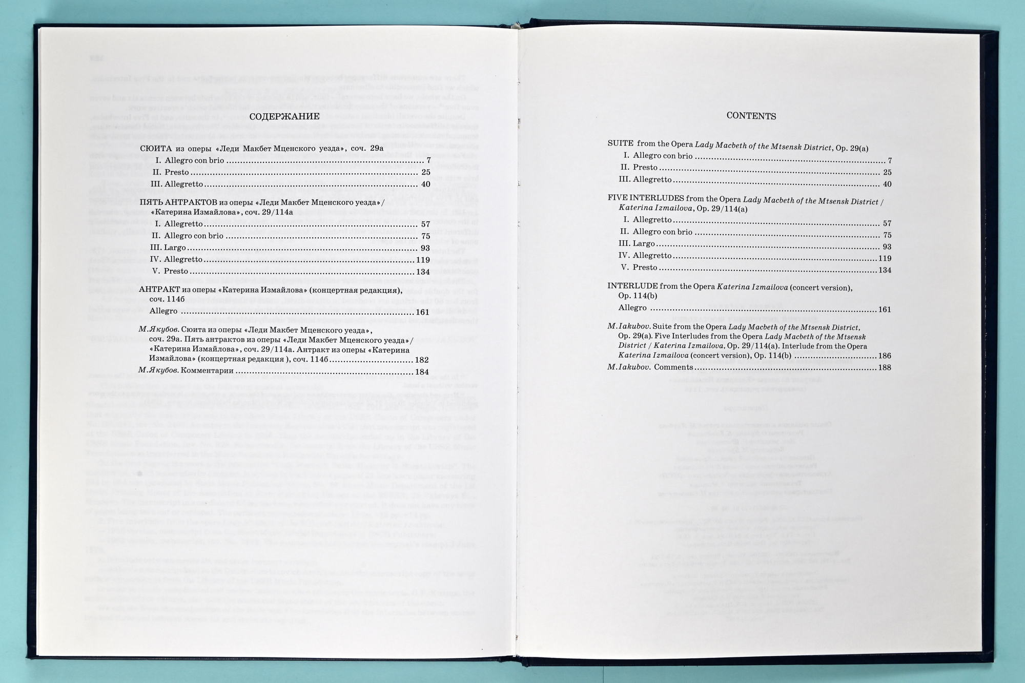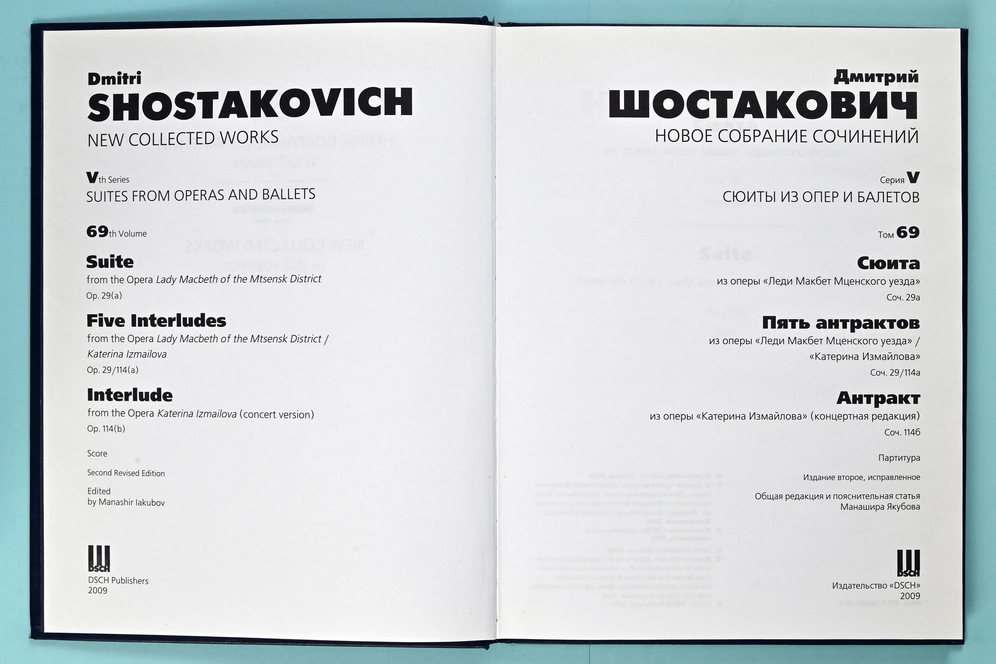 Сюита из оперы «Леди Макбет Мценского уезда». Соч. 29а. Пять антрактов из оперы «Леди Макбет Мценского уезда» («Катерина Измайлова»). Соч. 29/114а. Антракт между 6 и 7 картинами из оперы «Катерина Измайлова» (инструментовка без банды). Соч. 114б. Редактор Ольга Кузина. Пояснительная статья Манашир Якубов. Публикуется впервые.